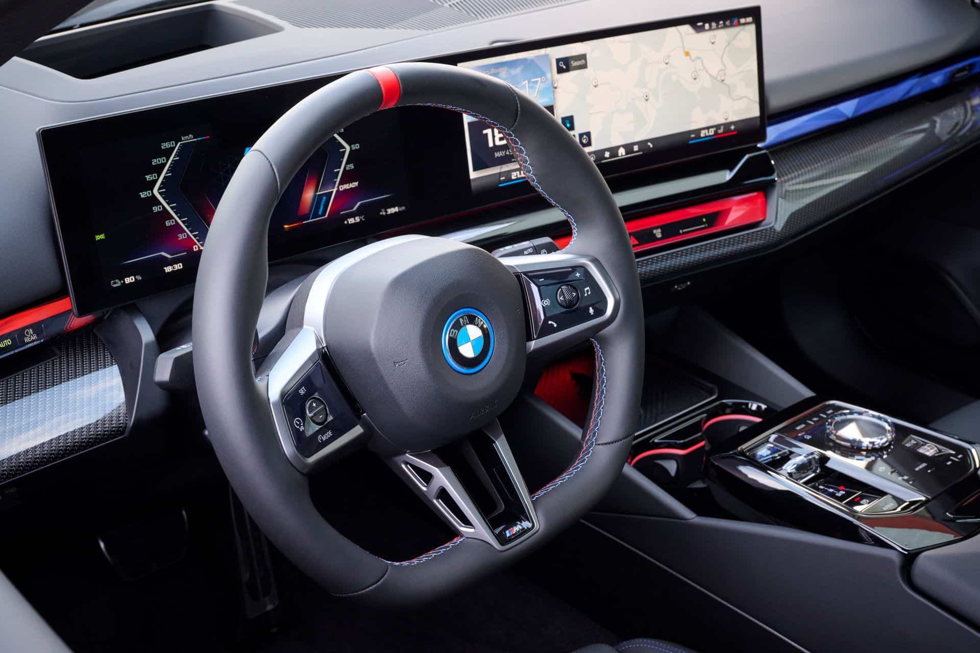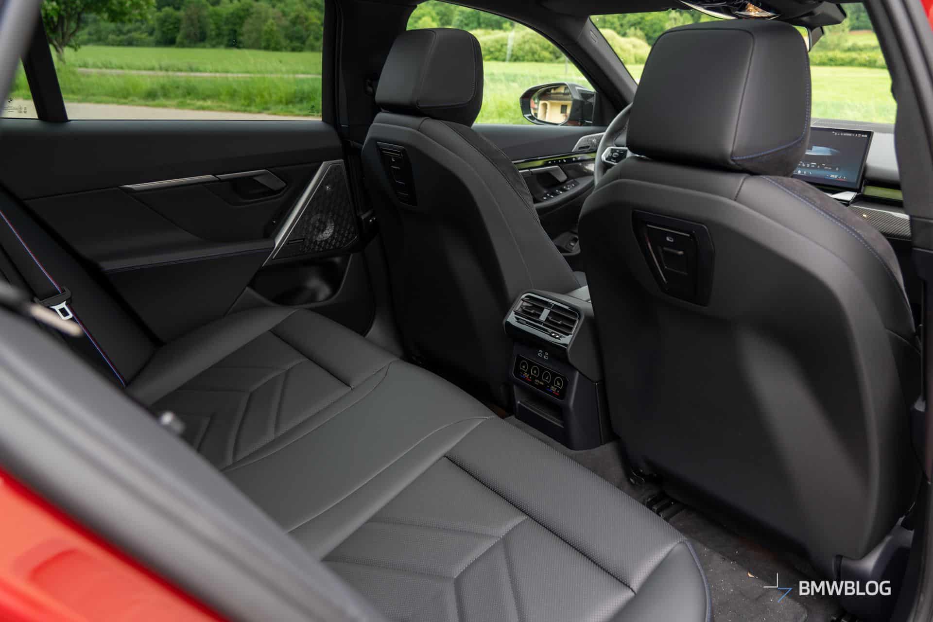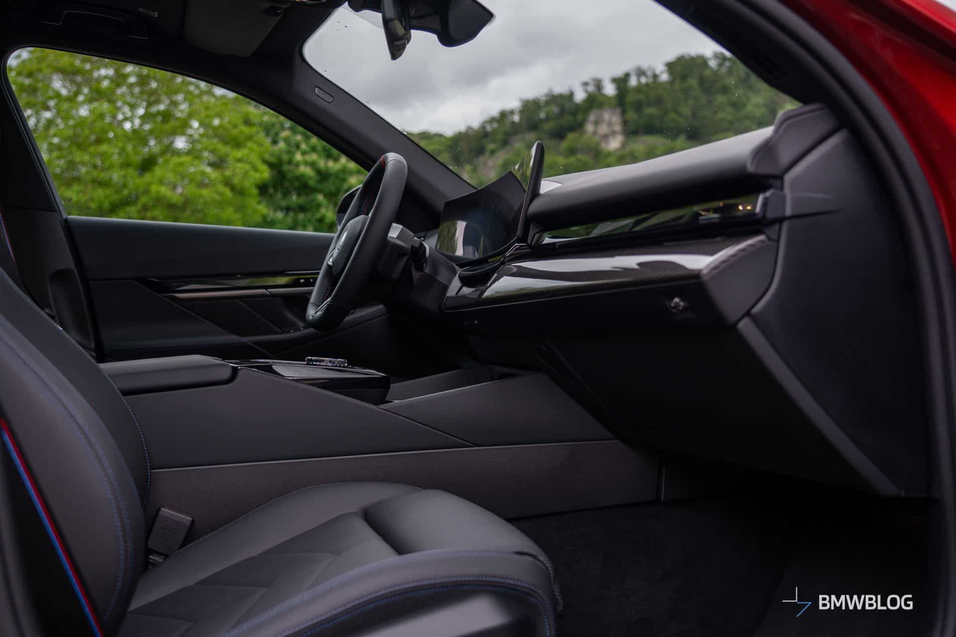 We’d argue the interior is less daring since BMW played it safe with this build. The family-friendly i5 M60 has the basic Veganza artificial leather upholstery with Alcantara and blue stitching. You’ll also notice the dashboard’s carbon fiber trim extends onto the door cards. Real leather and other trim options are available to spice up the cabin.
