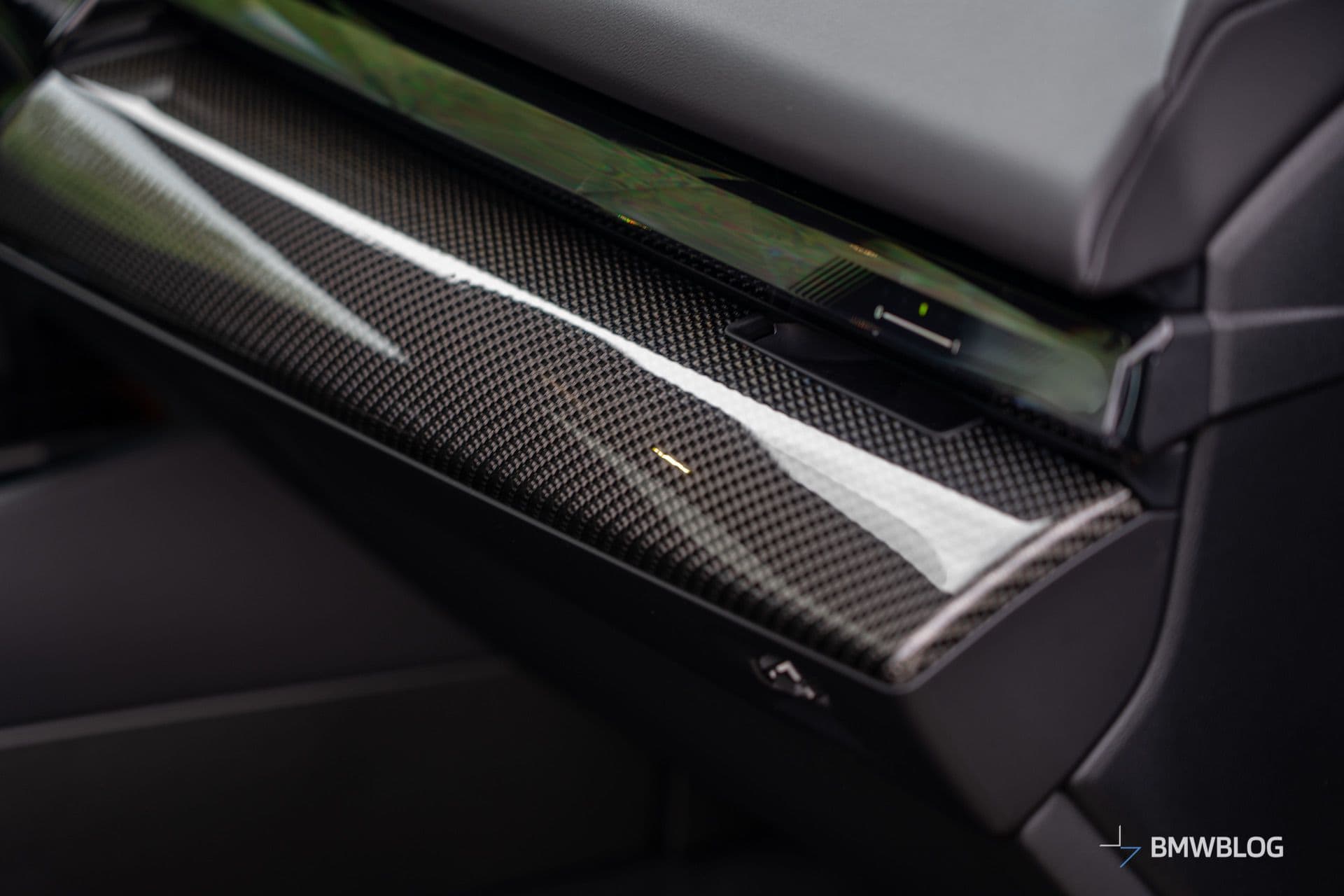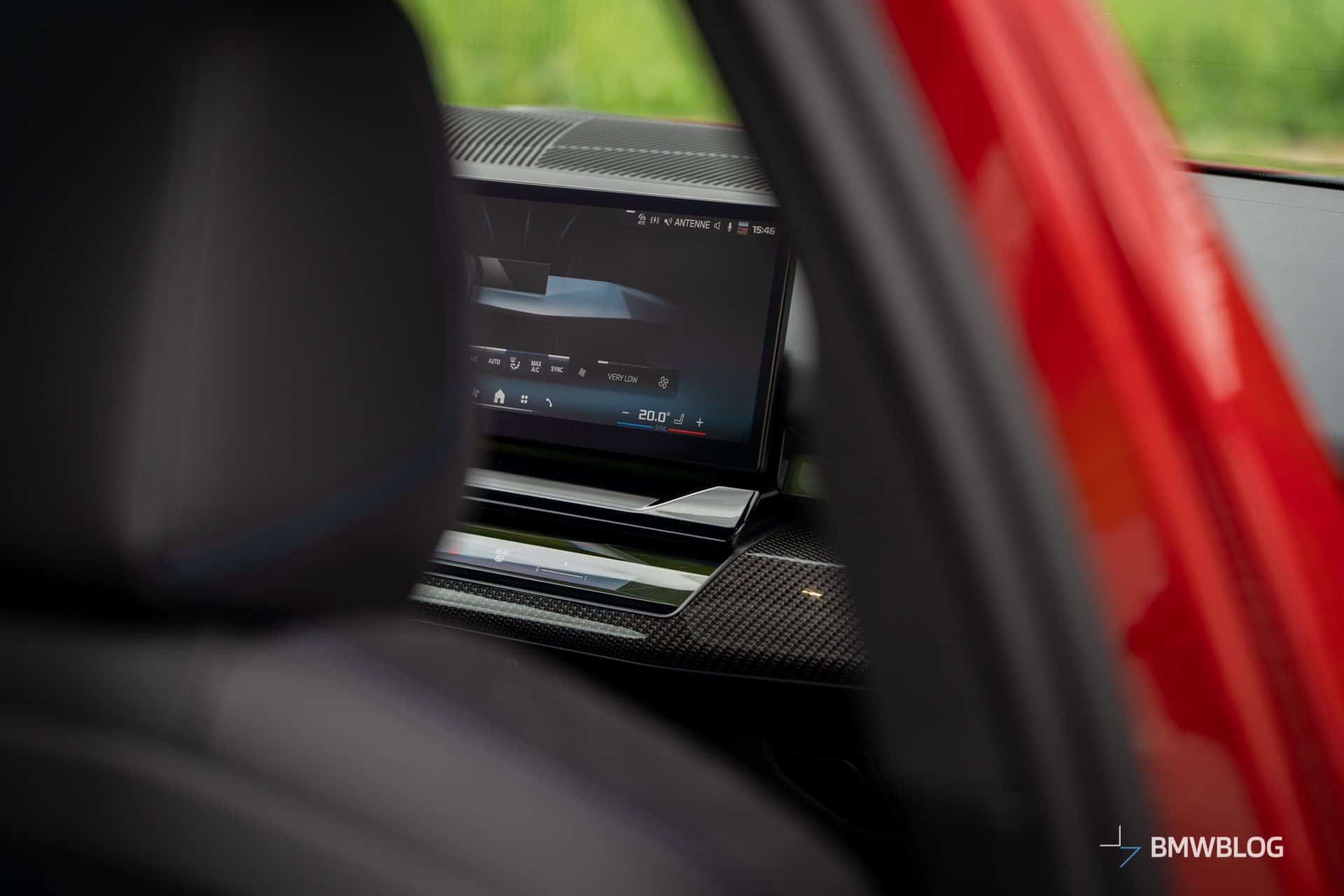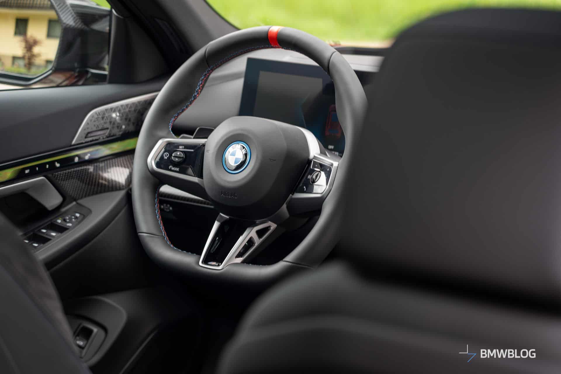 We’d argue the interior is less daring since BMW played it safe with this build. The family-friendly i5 M60 has the basic Veganza artificial leather upholstery with Alcantara and blue stitching. You’ll also notice the dashboard’s carbon fiber trim extends onto the door cards. Real leather and other trim options are available to spice up the cabin.