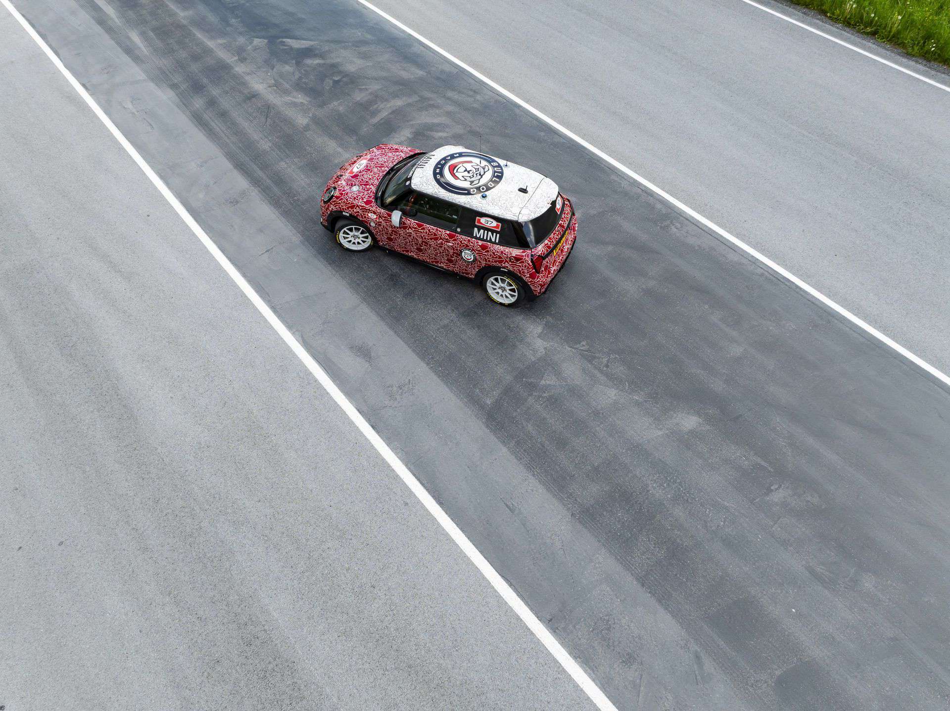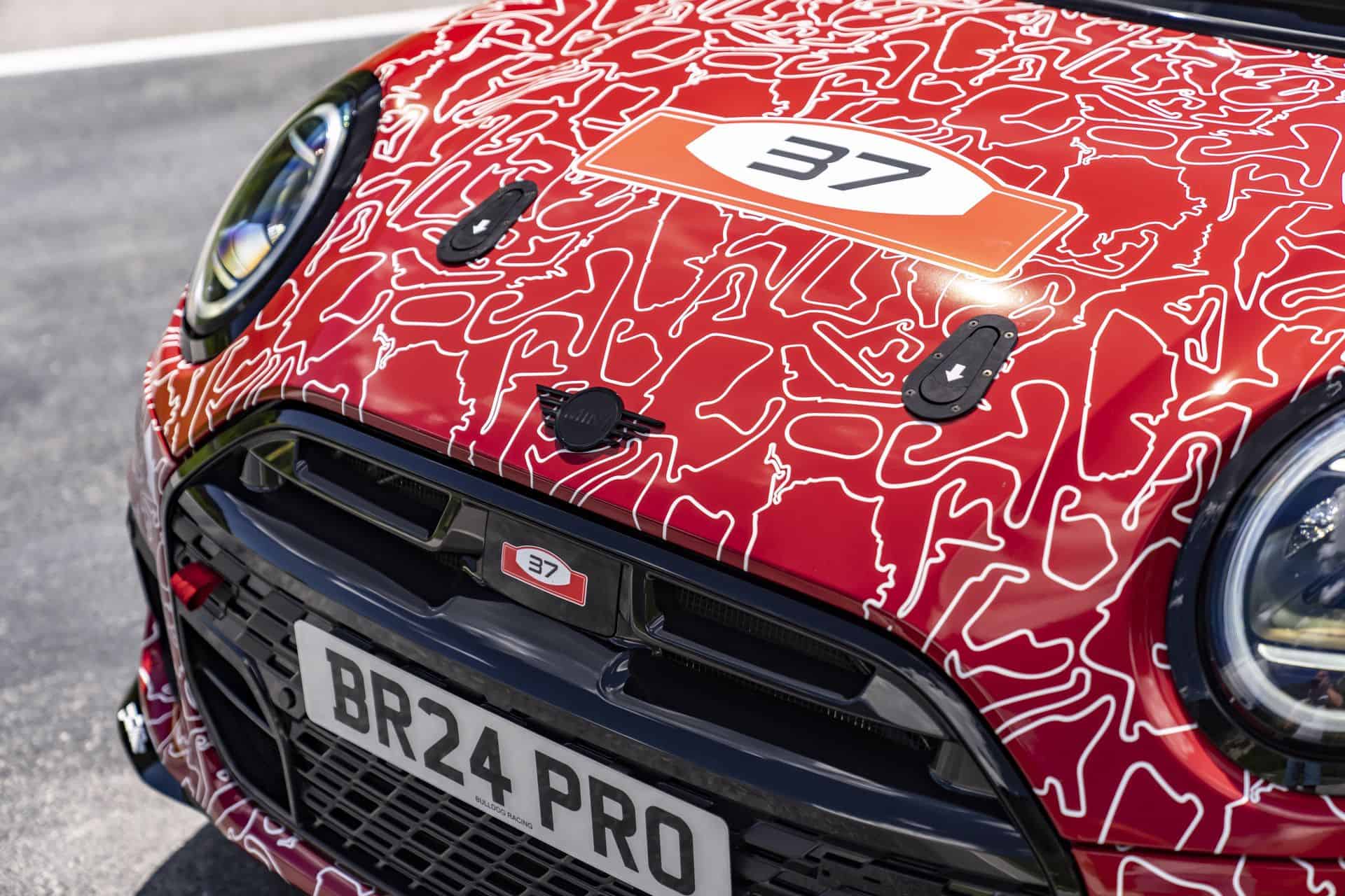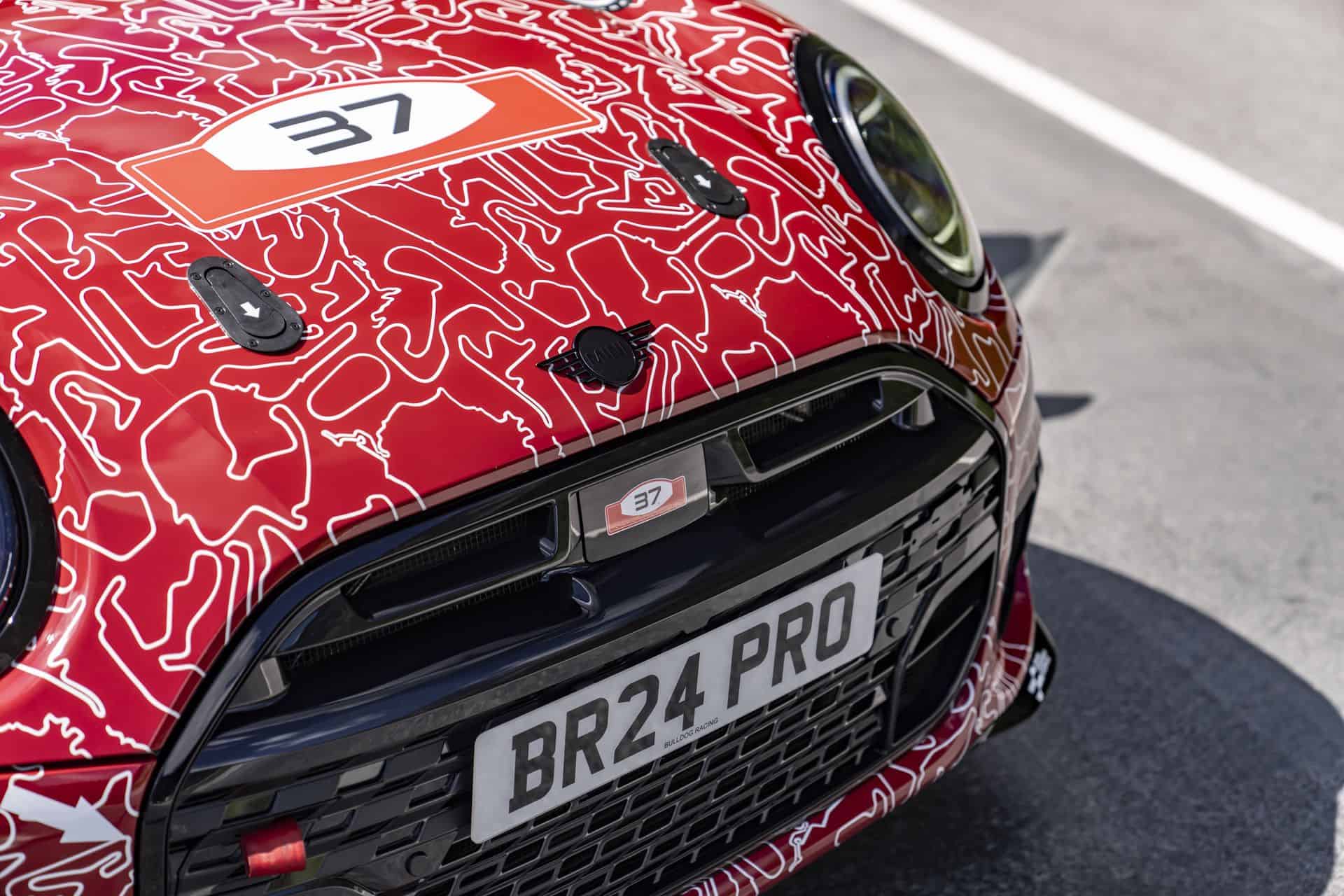 The MINI John Cooper Works PRO, designated as #317, is based on the new MINI John Cooper Works model, making its debut at the Nürburgring ahead of its world premiere in the fall of 2024. This car is camouflaged in a striking red and white motorsport wrap designed by the MINI Design Team, adding an element of intrigue and excitement. Built in Oxford, UK, and refined in Nürburg by Bulldog Racing, the MINI John Cooper Works PRO shows that endurance motorsport can still be exciting and fun.