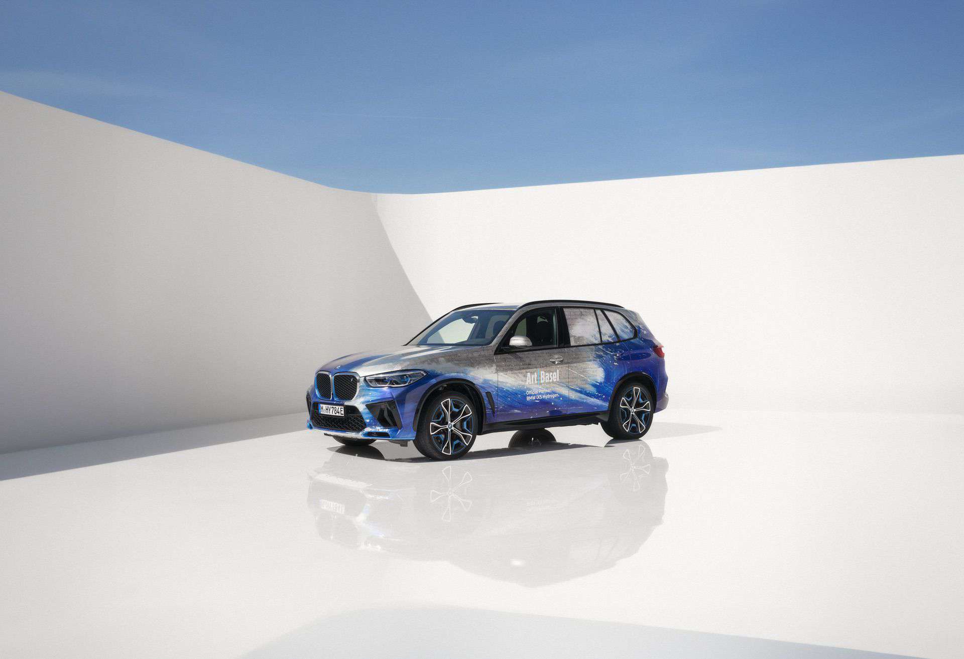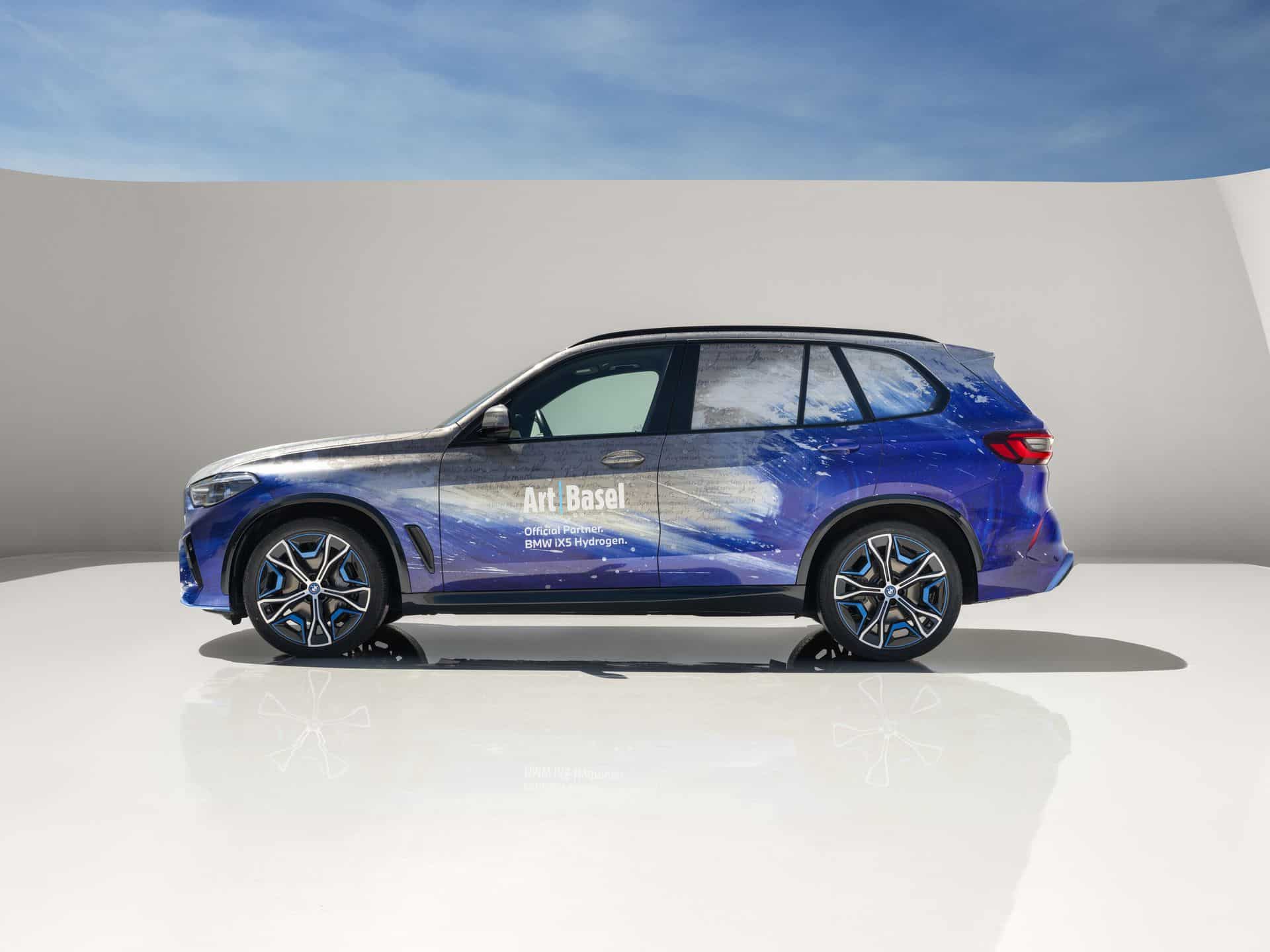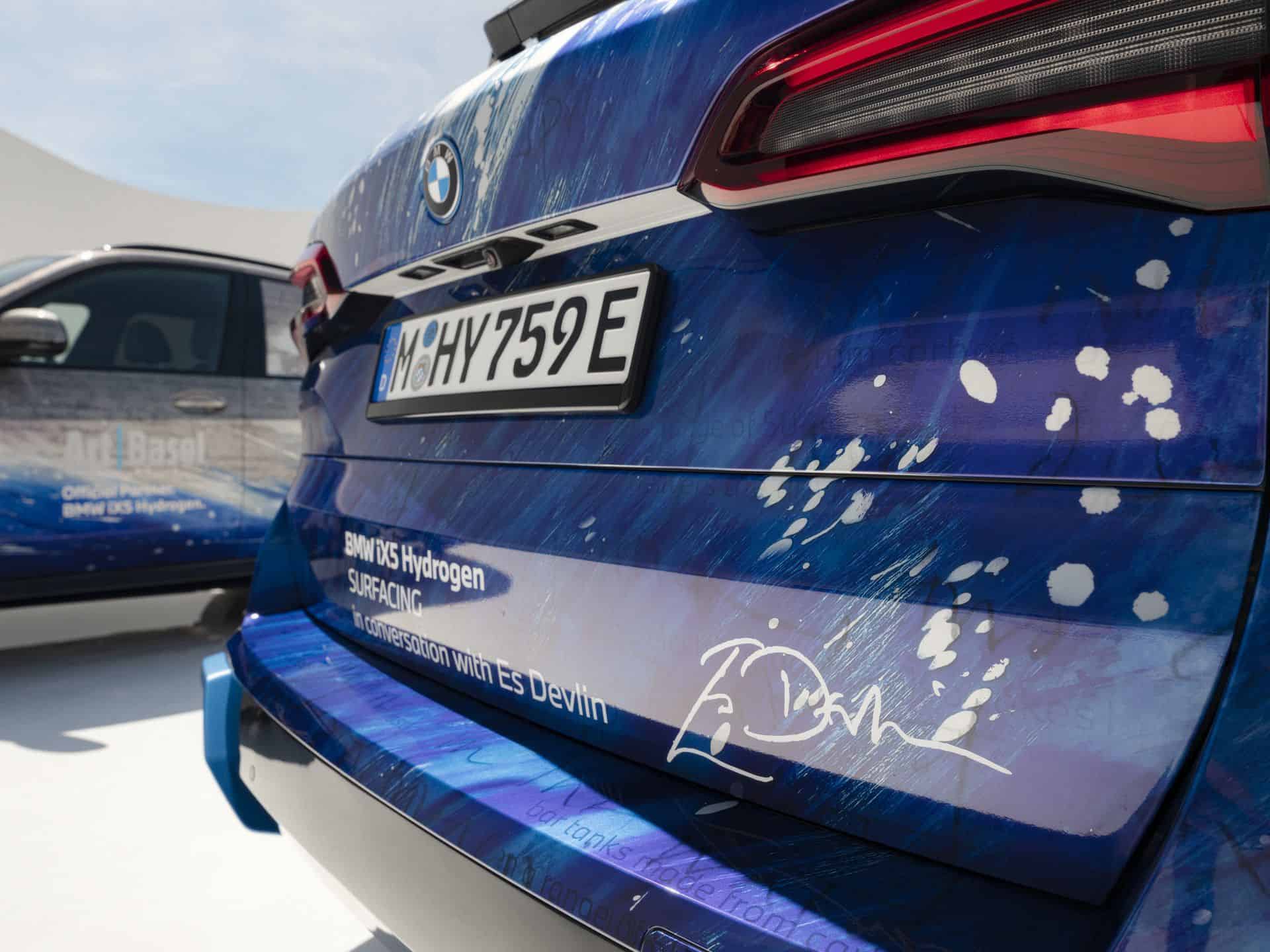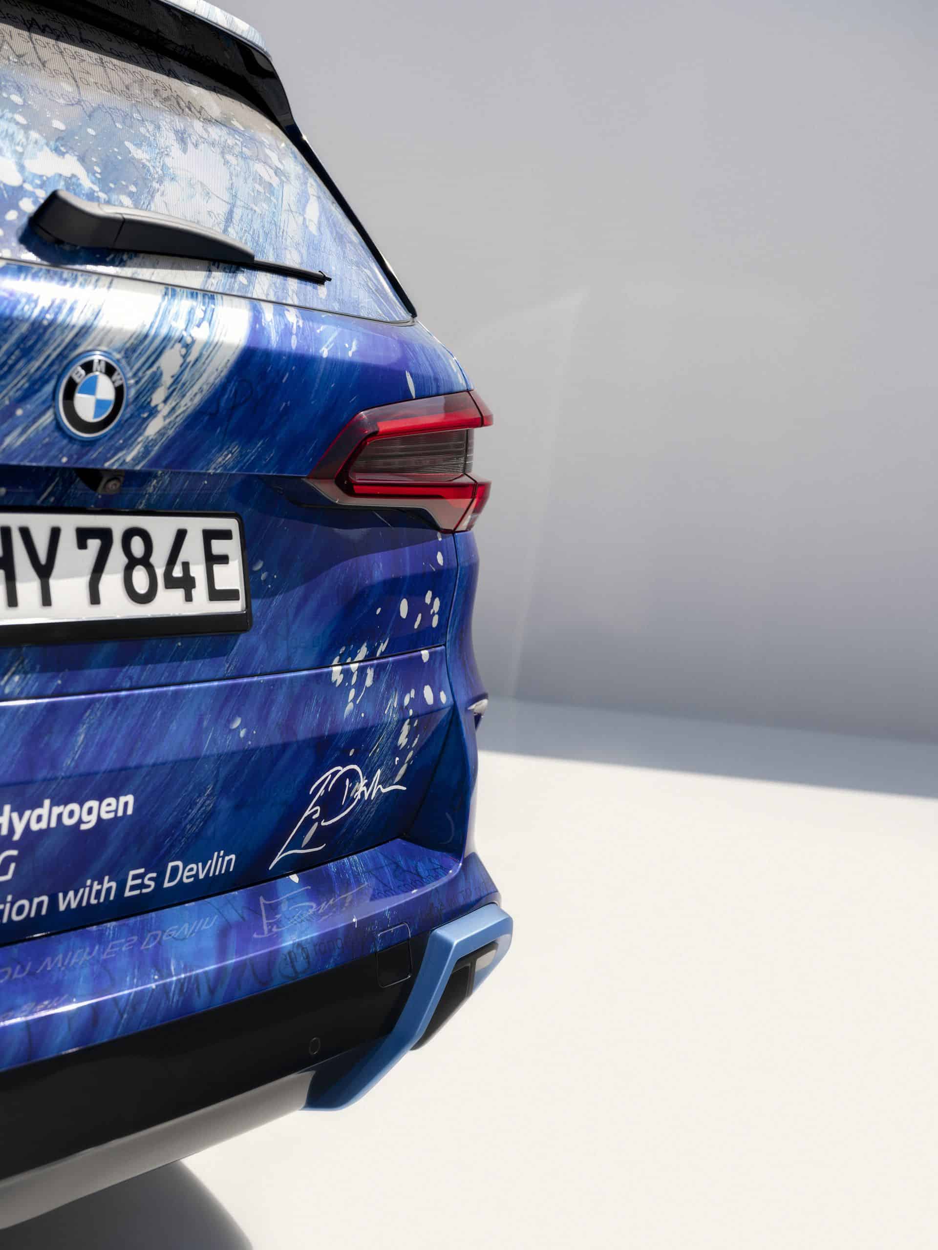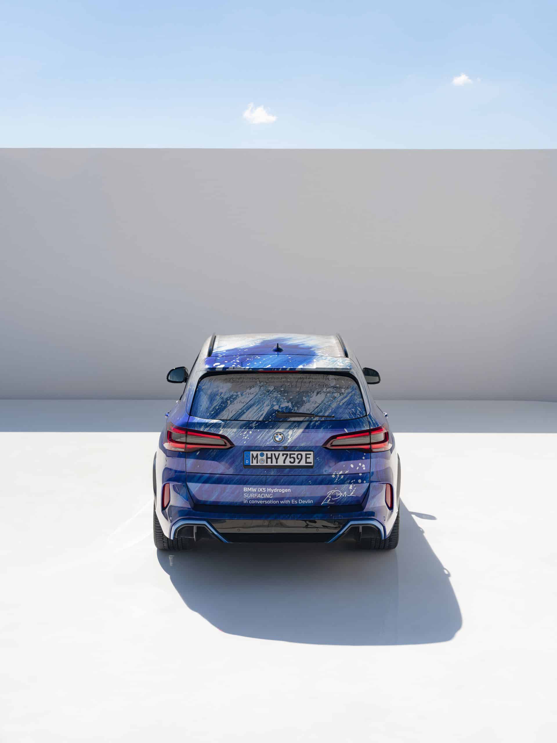 The exterior of the BMW iX5 Hydrogen features a blue and white collage, overlaying paintings and text inspired by Devlin’s teenage wall prints and literature. Gestures echoing Hokusai’s “The Great Wave off Kanagawa” are superimposed over handwritten extracts from James Joyce’s “Ulysses.” Underneath are excerpts from BMW Group publications on hydrogen fuel cell technology.