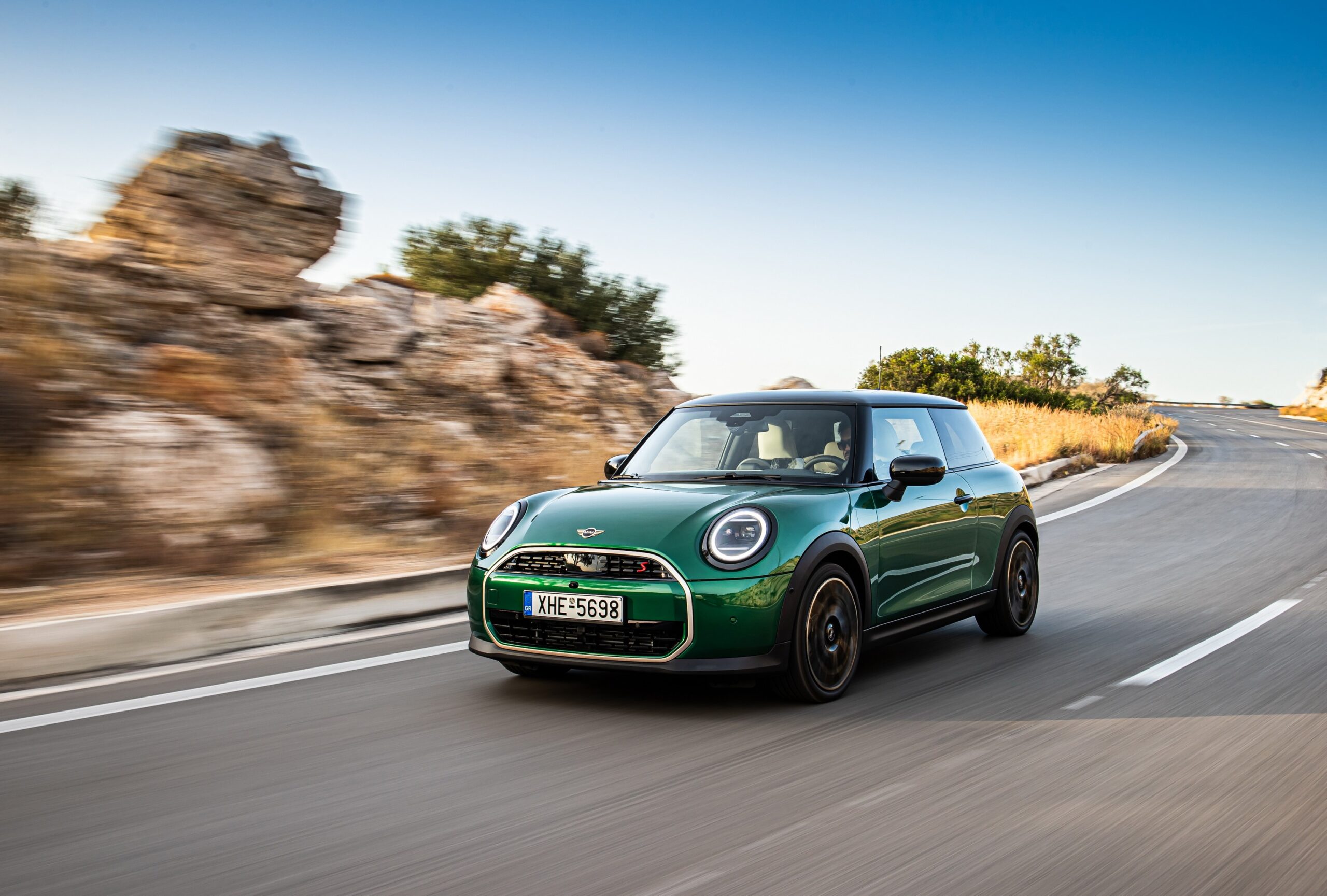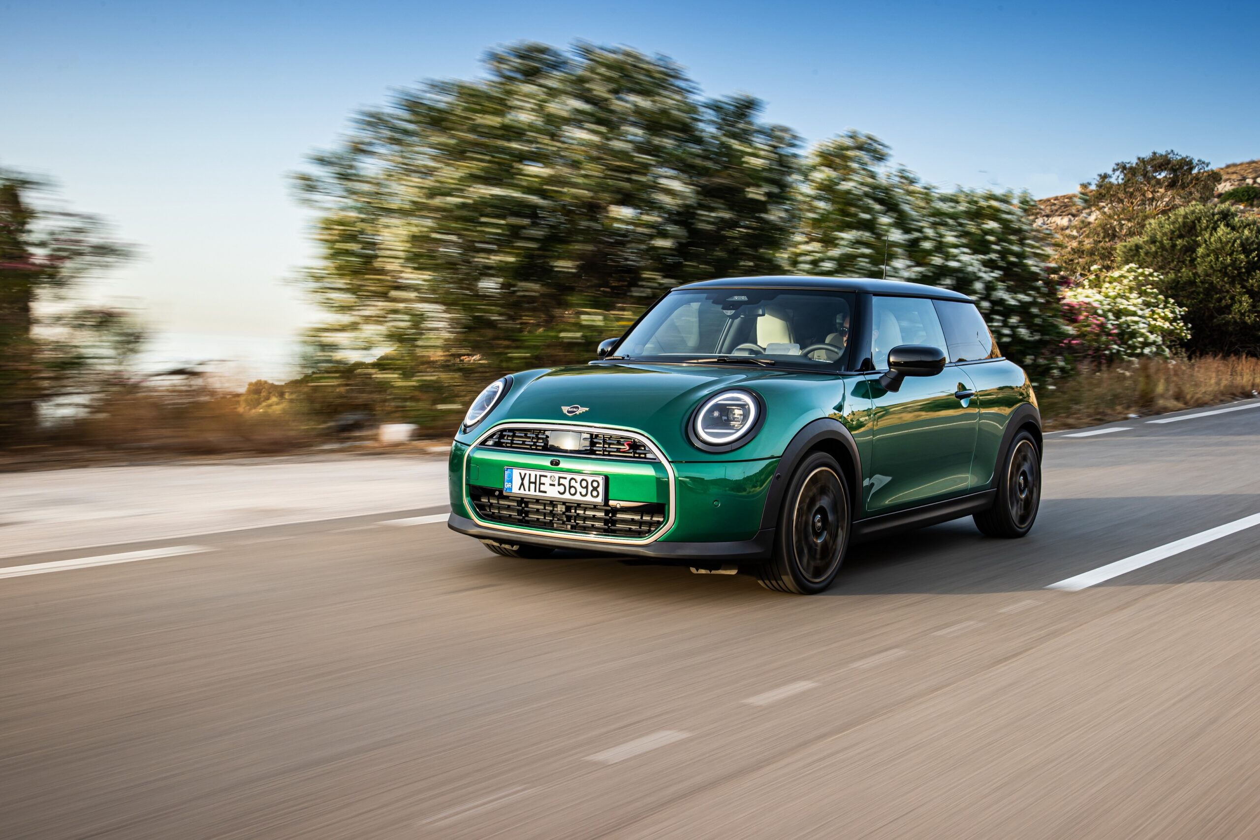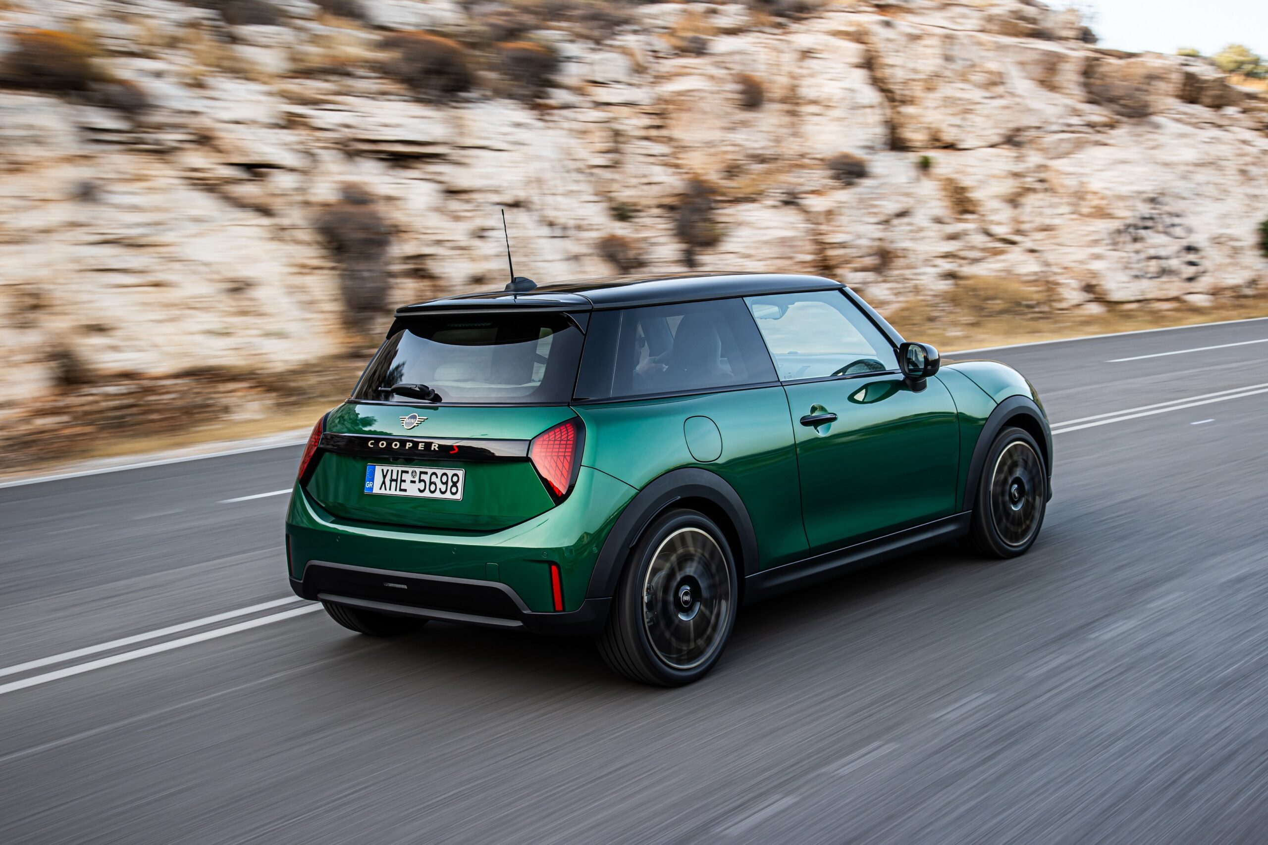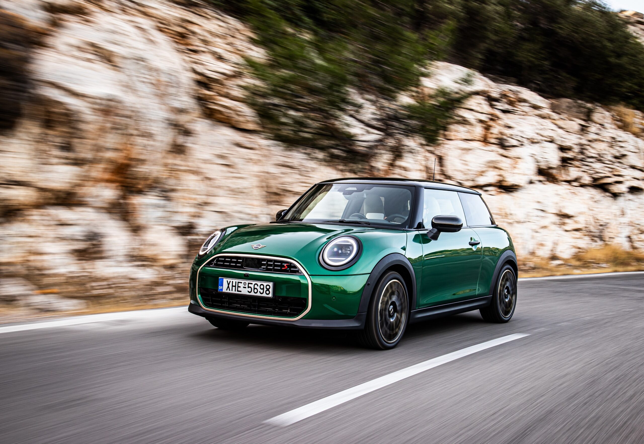 MINI has refreshed nearly its entire lineup for 2024, and that includes the 3-Door Hatch. Codenamed F66, the stylish city car touched down in Greece where it was photographed in Athens. Seen here is the hooter Cooper S painted in British Racing Green with a contrasting black roof. The diminutive hatchback rides on the optional 18-inch, two-tone wheels dubbed “Night Flash.”