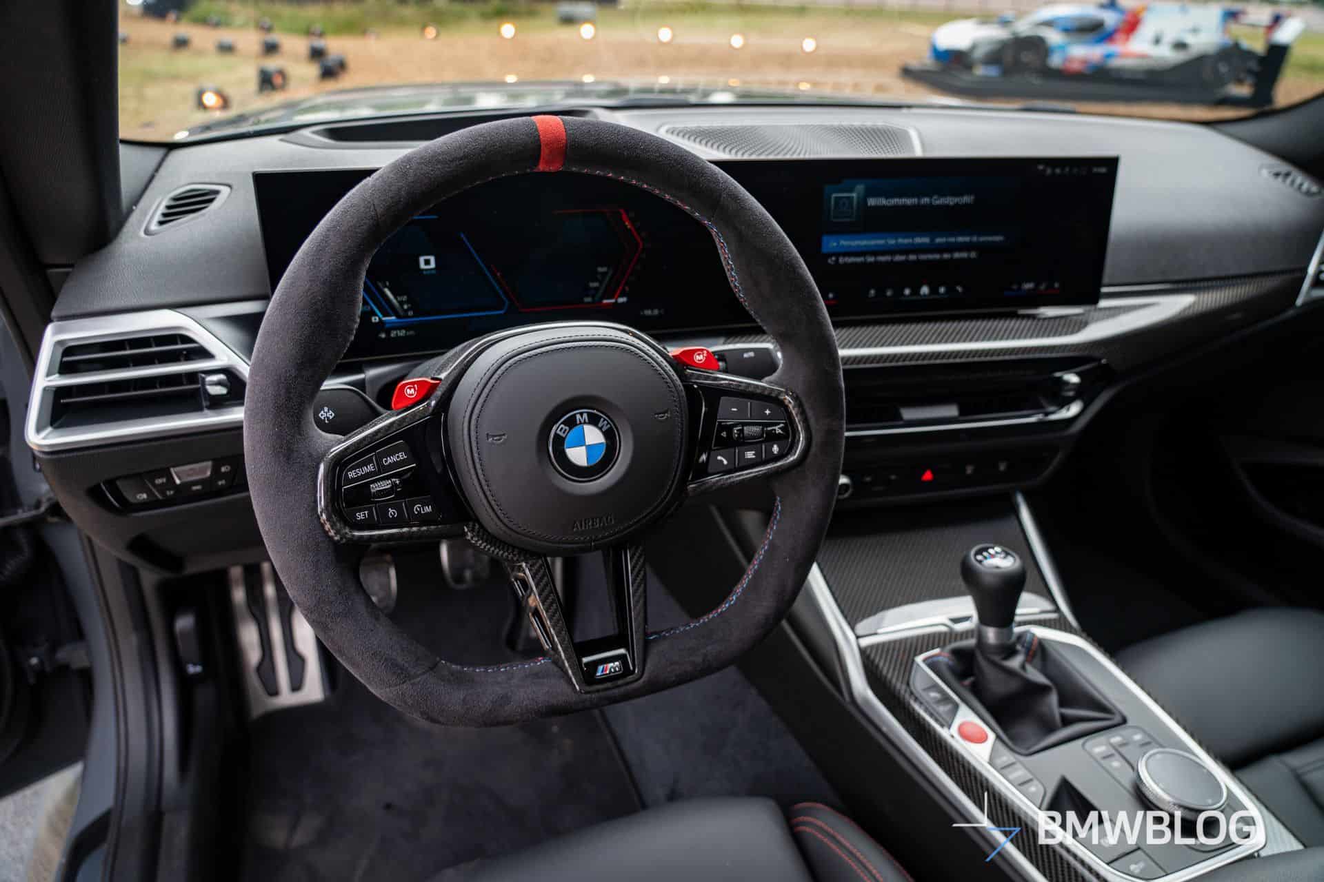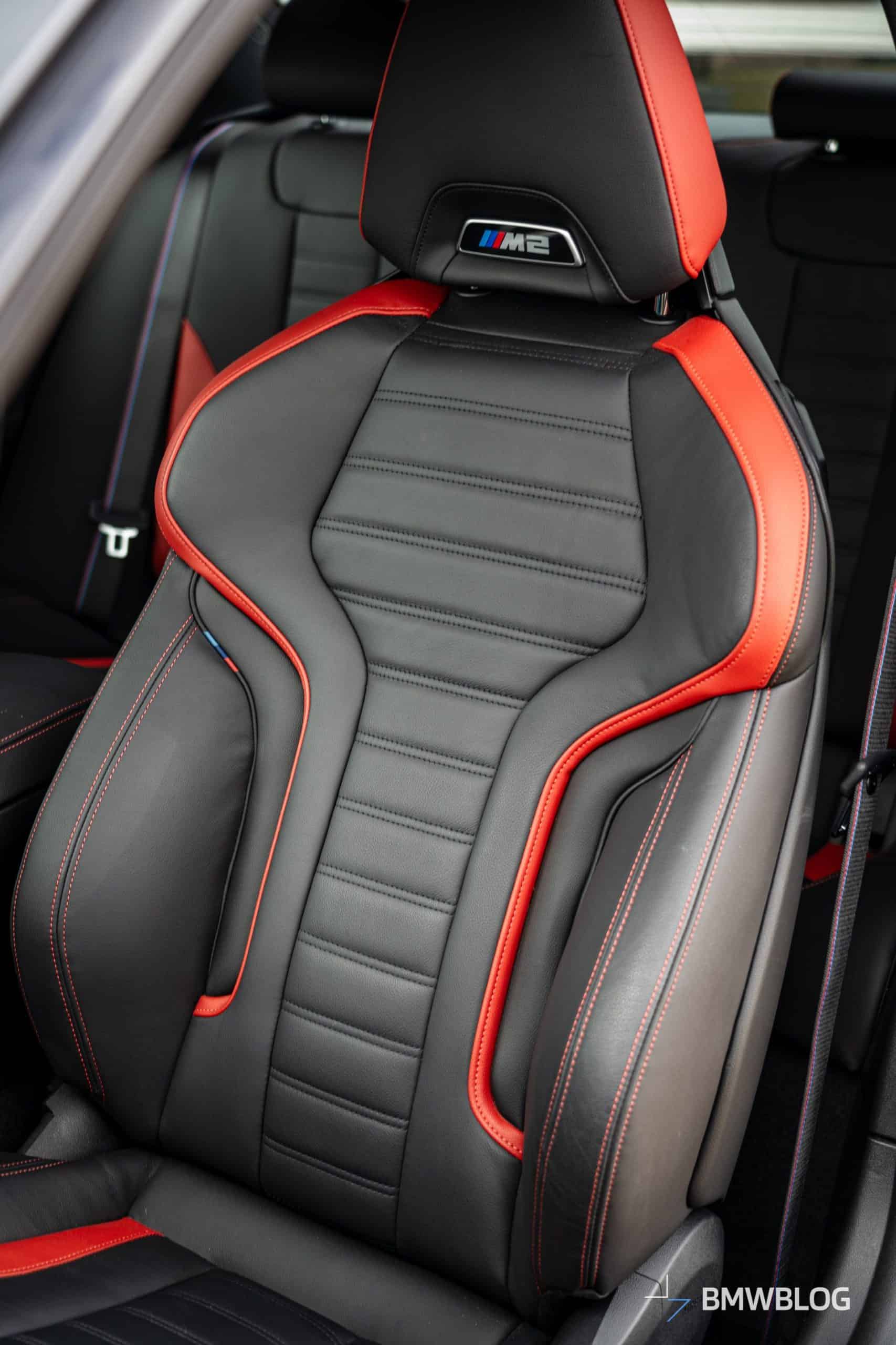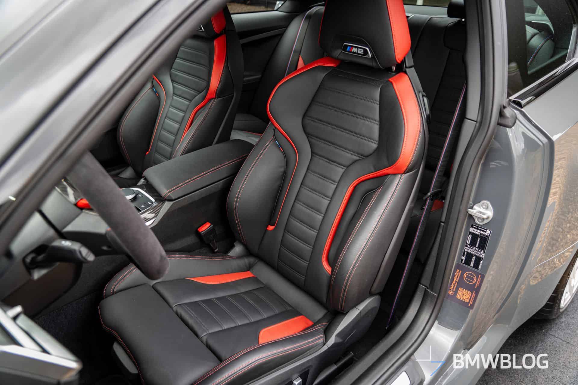 The last change on the outside is quite subtle. Take a closer look at the M2 badges and you’ll notice they’re now black with a silver contour. Going forward, the trim around the quad exhaust tips will be black as standard. Inside, the flat-bottomed steering wheel with a 12 o’clock red mark is also debuting with the 2025 model year. It’s shown here with an optional Alcantara finish whereas the standard wheel comes wrapped in leather.