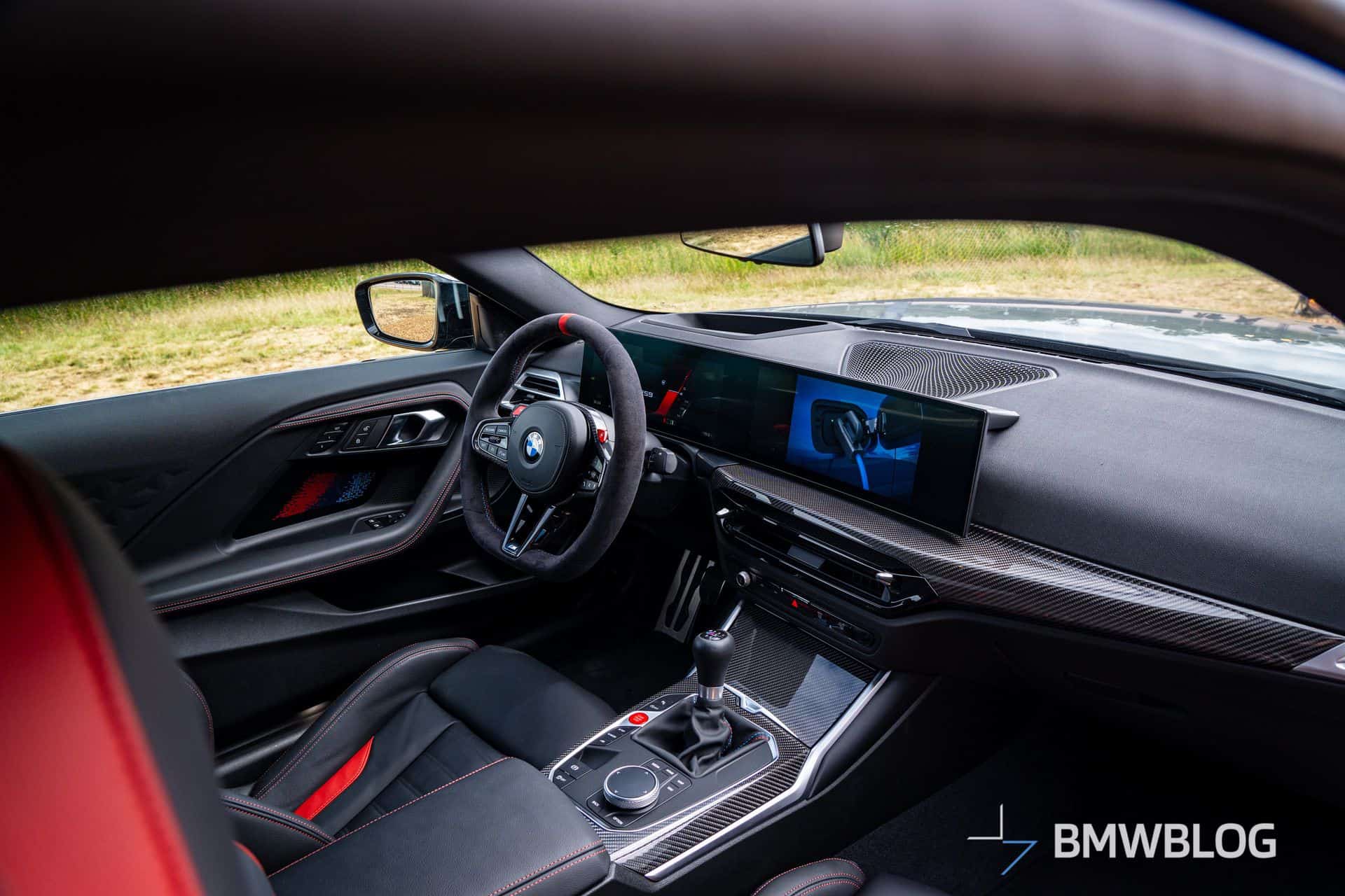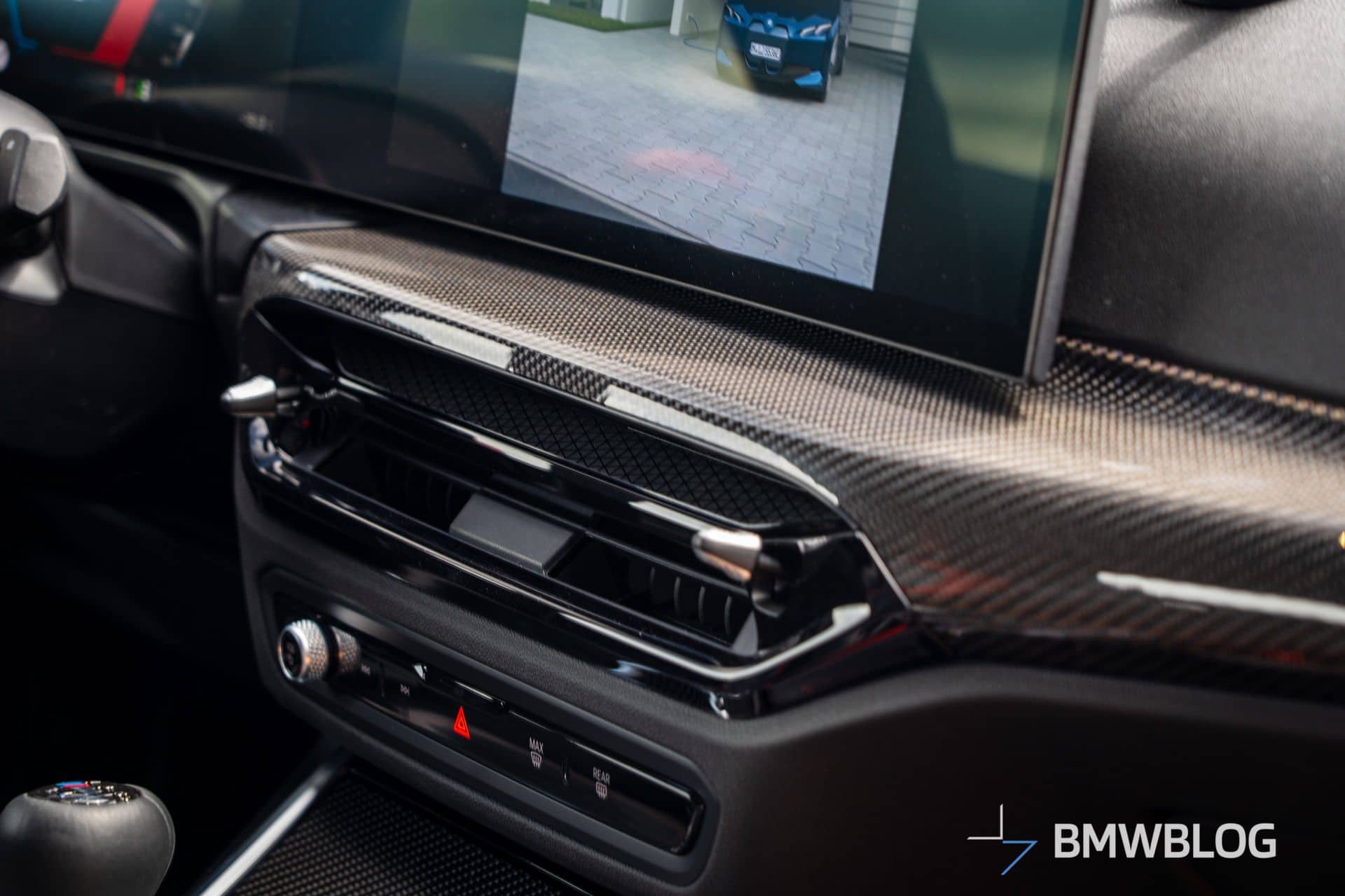 Eagle-eyed readers will see the slightly modified adjustment controls for the air vents. BMW opted to showcase the mildly revised M2 with the black and red Vernasca leather, another novelty for 2025. While a Dark Graphite matt trim is now standard in Europe, this manual-equipped car flaunts carbon fiber on the dashboard and center console.