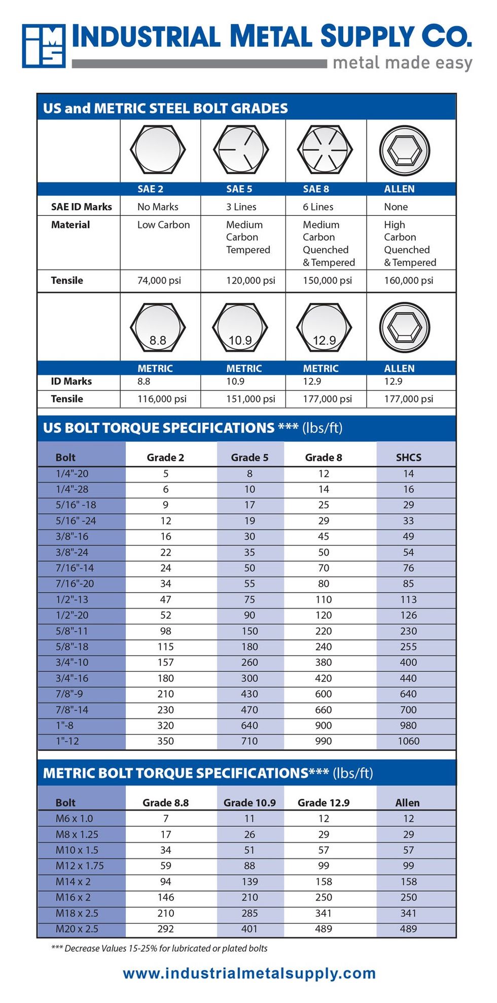 You’ll notice that both SAE and metric fasteners have “grades” or “classes.” This refers to the ultimate strength of the bolt based upon its material and treatment. Unmarked SAE bolts are Grades 1 or 2. For critical installations, stick with Grade 5 or Grade 8, with the former usually more than adequate for most situations. For example, using a Grade 8 bolts to assemble sheet metal is overkill.