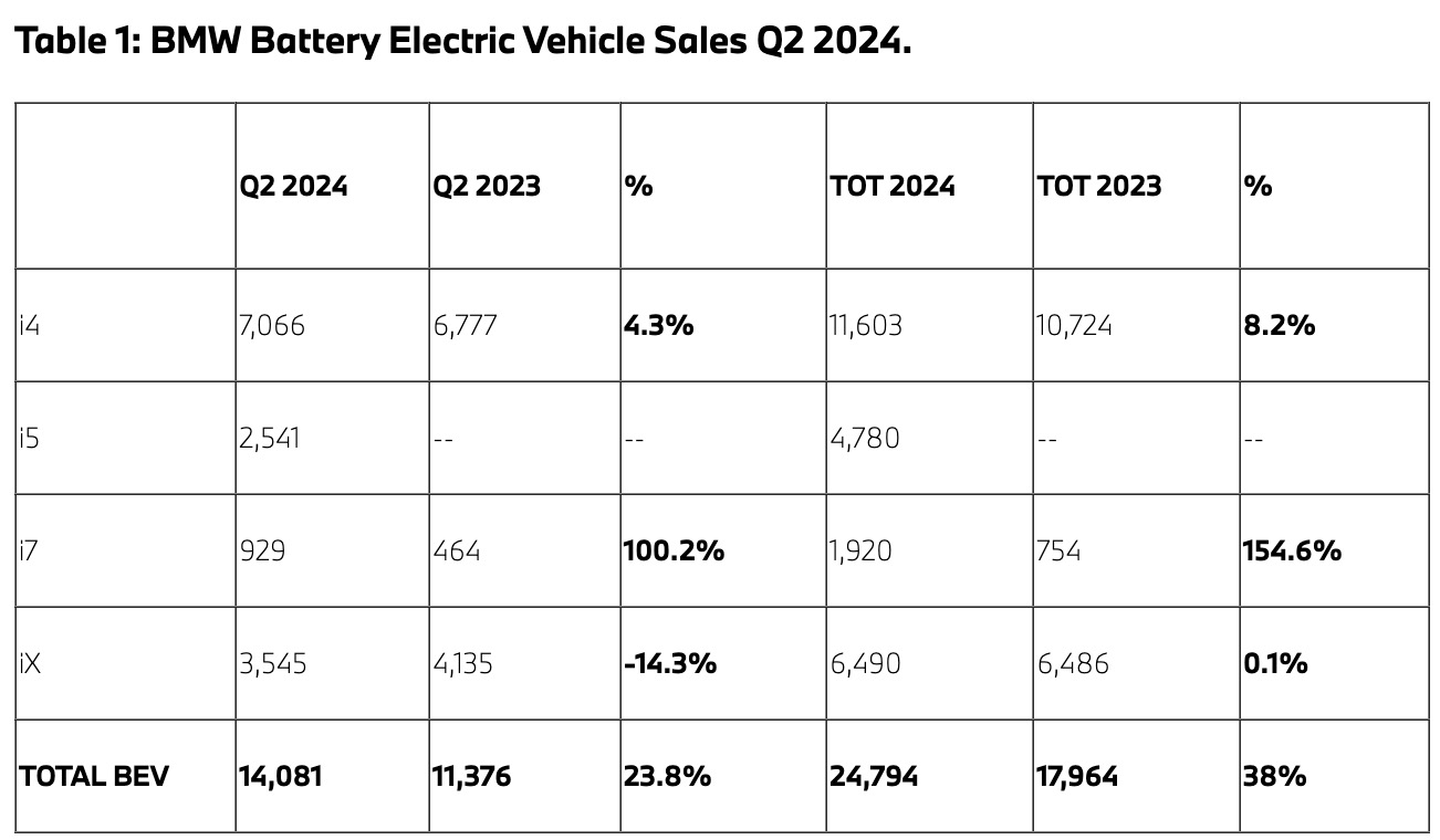 Sales of BMW Battery Electric Vehicles Increase 23.8% vs Q2 2023.