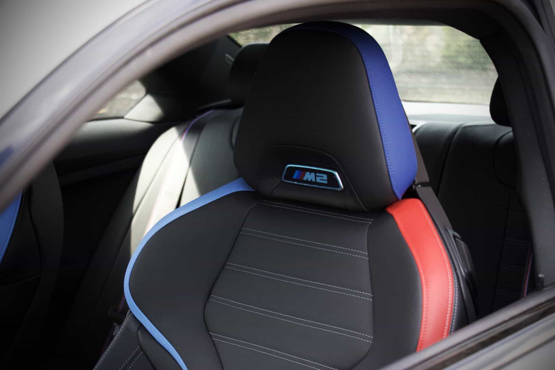 The 2024 BMW M2 offers upholstery options including Black Vernasca Leather with Blue or Red stitching, Cognac Vernasca Leather, and an Alcantara/leather combination with Blue stitching. Seat options include standard M Sport Seats with adjustable bolsters and heating, and optional M Carbon Bucket Seats with enhanced lateral support, integrated headrests, and an illuminated M2 logo.