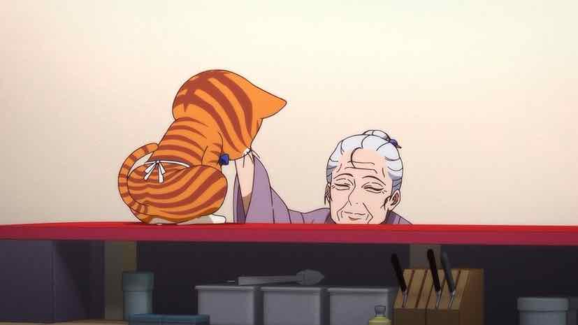 Who is Tajima-san? She’s the menma lady, and quite an intimidating figure (only Hana is willing to say that part out loud). Tajima only supplies menma to ramen shops she finds up to snuff, and she stops by for a surprise inspection (though in fact she’s just on her way to visit her grandchild overseas). Tajima is a tough old bird and she has a tough old cat herself – one who taught the staff how not to shed. Though they’ve been sworn to secrecy on the technique. She might also be the only customer who could get away with giving Bunshou scritches.