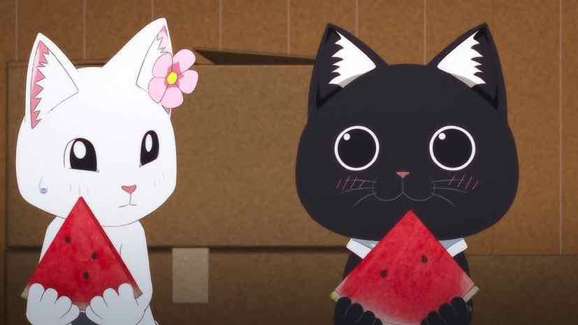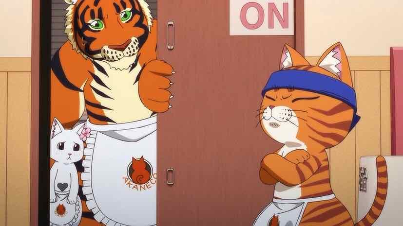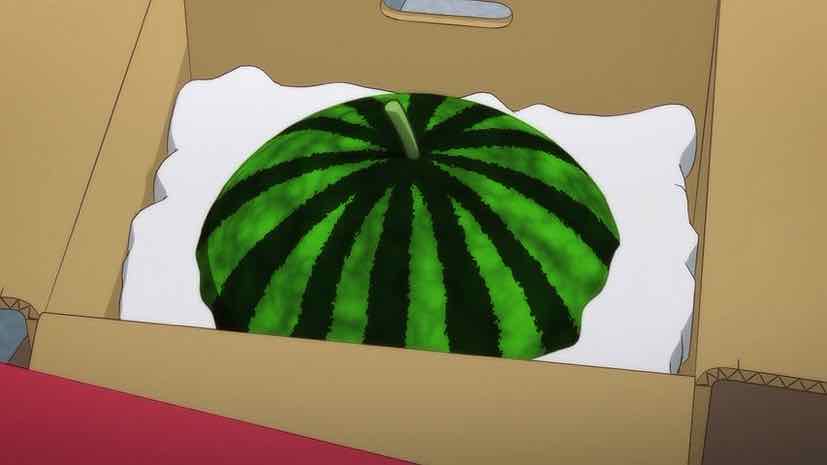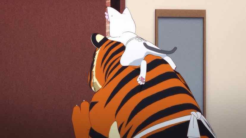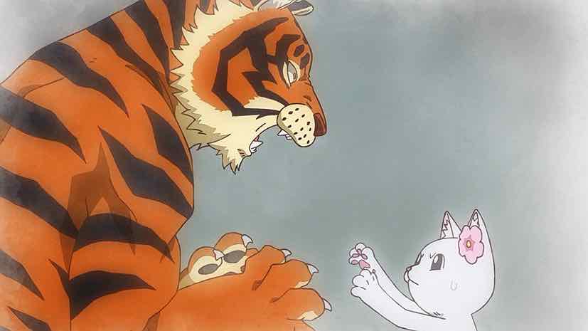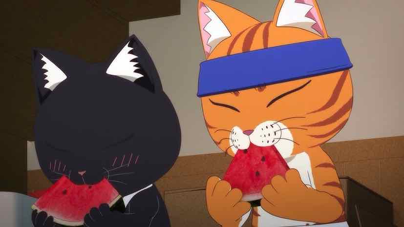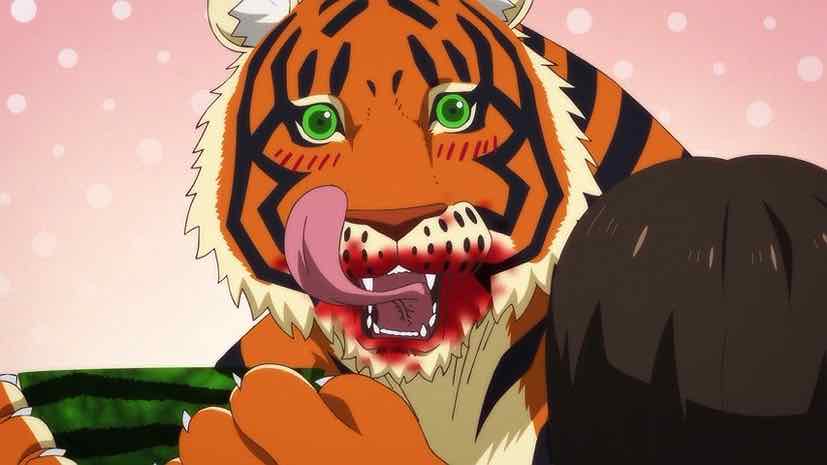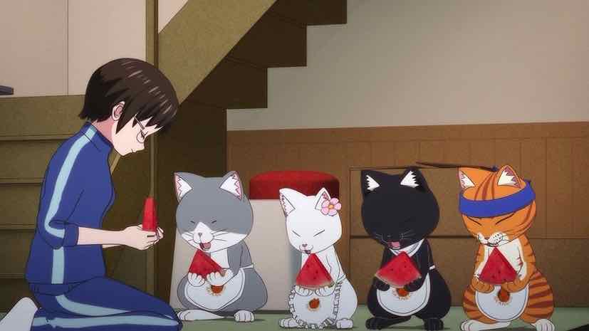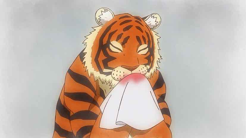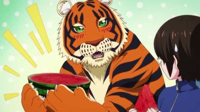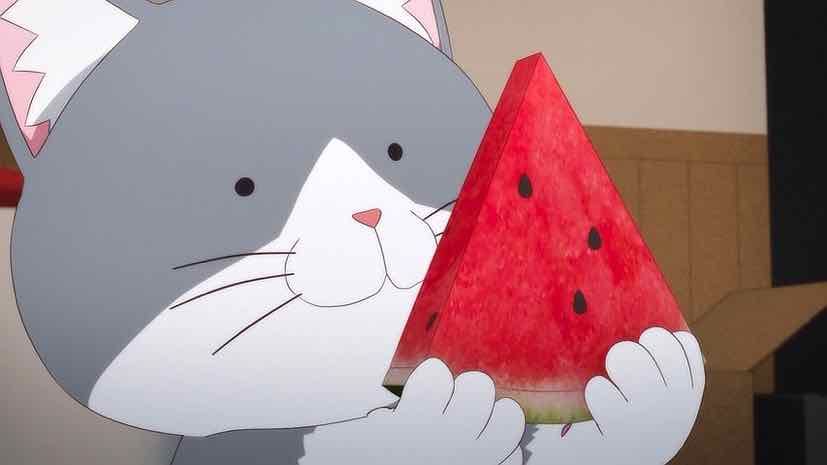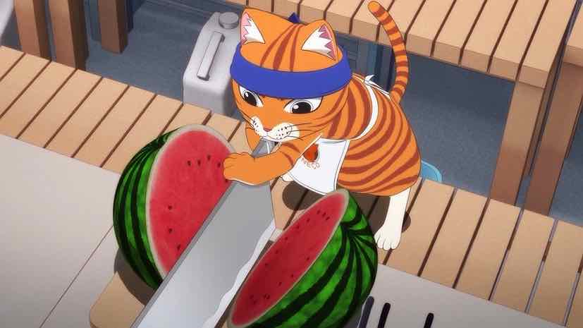 Next up Tamako-san brings a watermelon her family sent her for the staff. I’ve never seen a cat (certainly not one of mine) eat watermelon (which I guess is safe for them) but I have seen them eat some weird stuff, and some do have a sweet tooth. As it turns out Krishna absolutely loves the stuff, and buries her face in the large heel Bunzou cuts for her. This has the rather humorous but terrifying effect of transforming her tiger (why isn’t there a tiger equivalent of “leonine”?) visage quite profoundly.