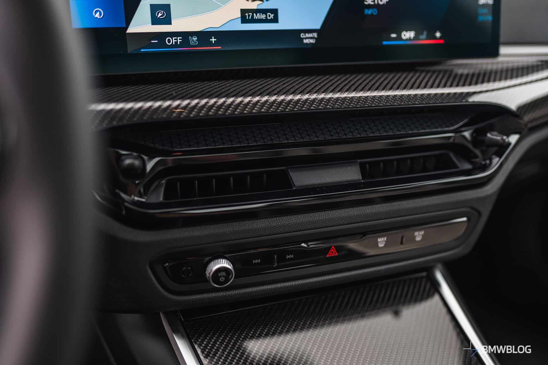 Stepping inside, BMW wants $4,500 for those carbon bucket seats in the front. This 2025 M4 has a Silverstone/Black interior but there are more daring alternatives. Yas Marina Blue, Kyalami Orange, and Fiona Red can all be combined with Black.