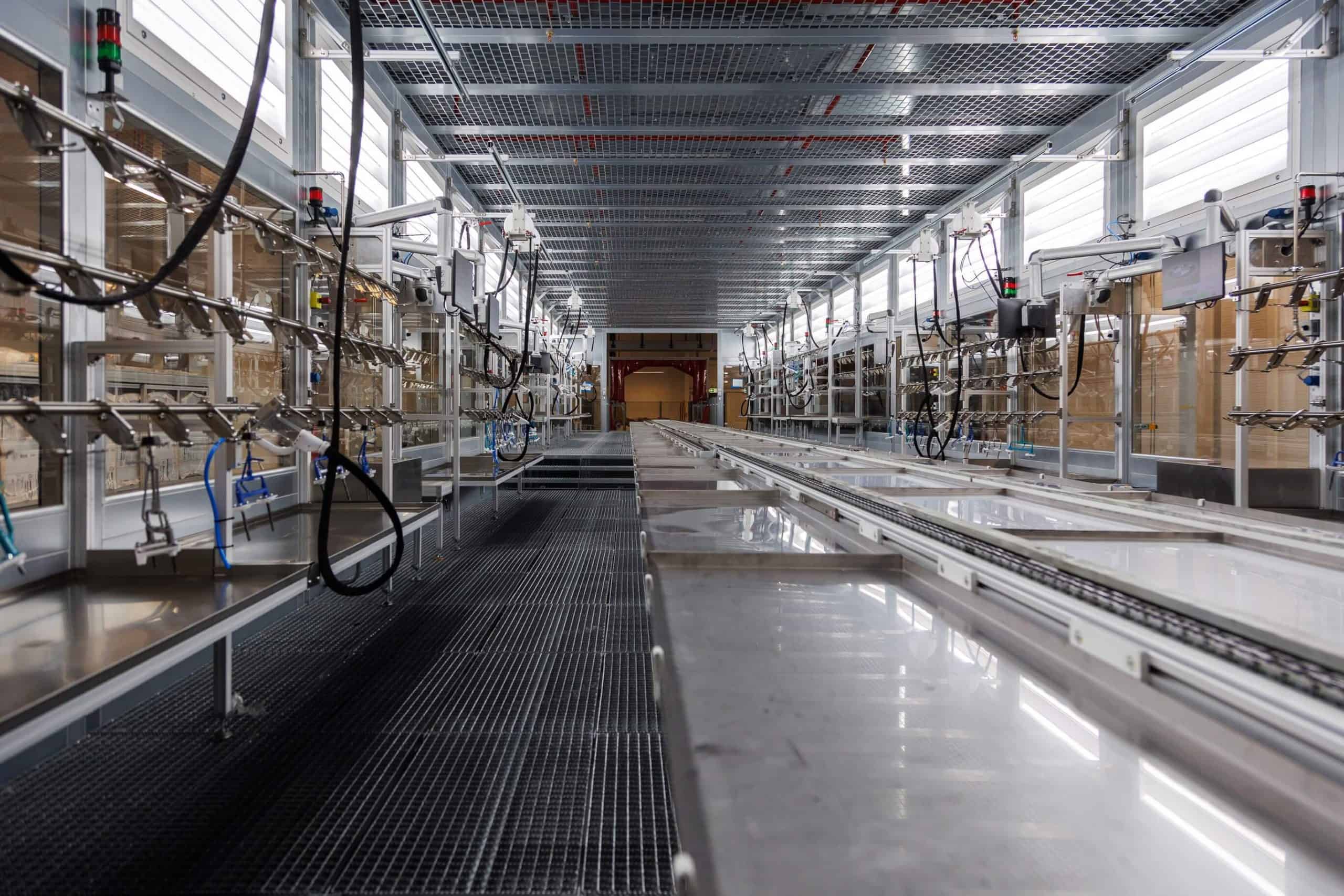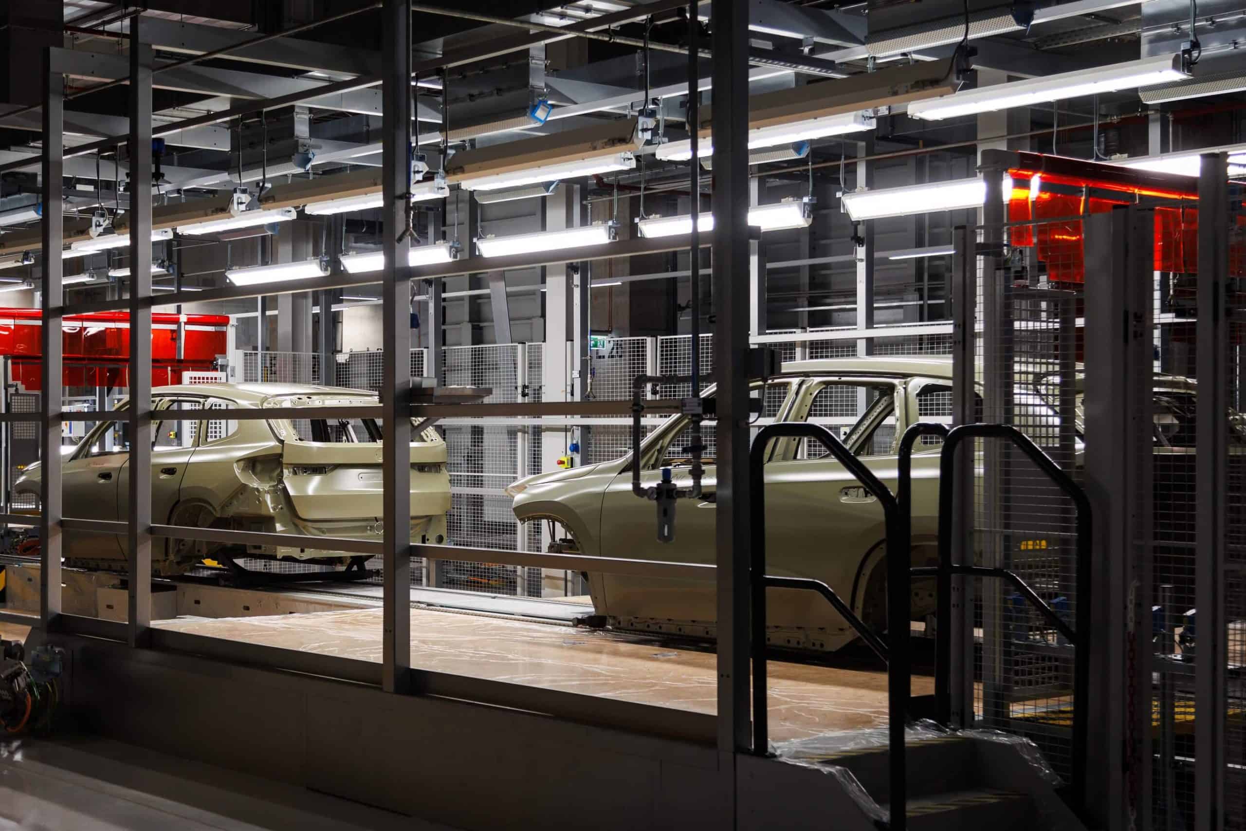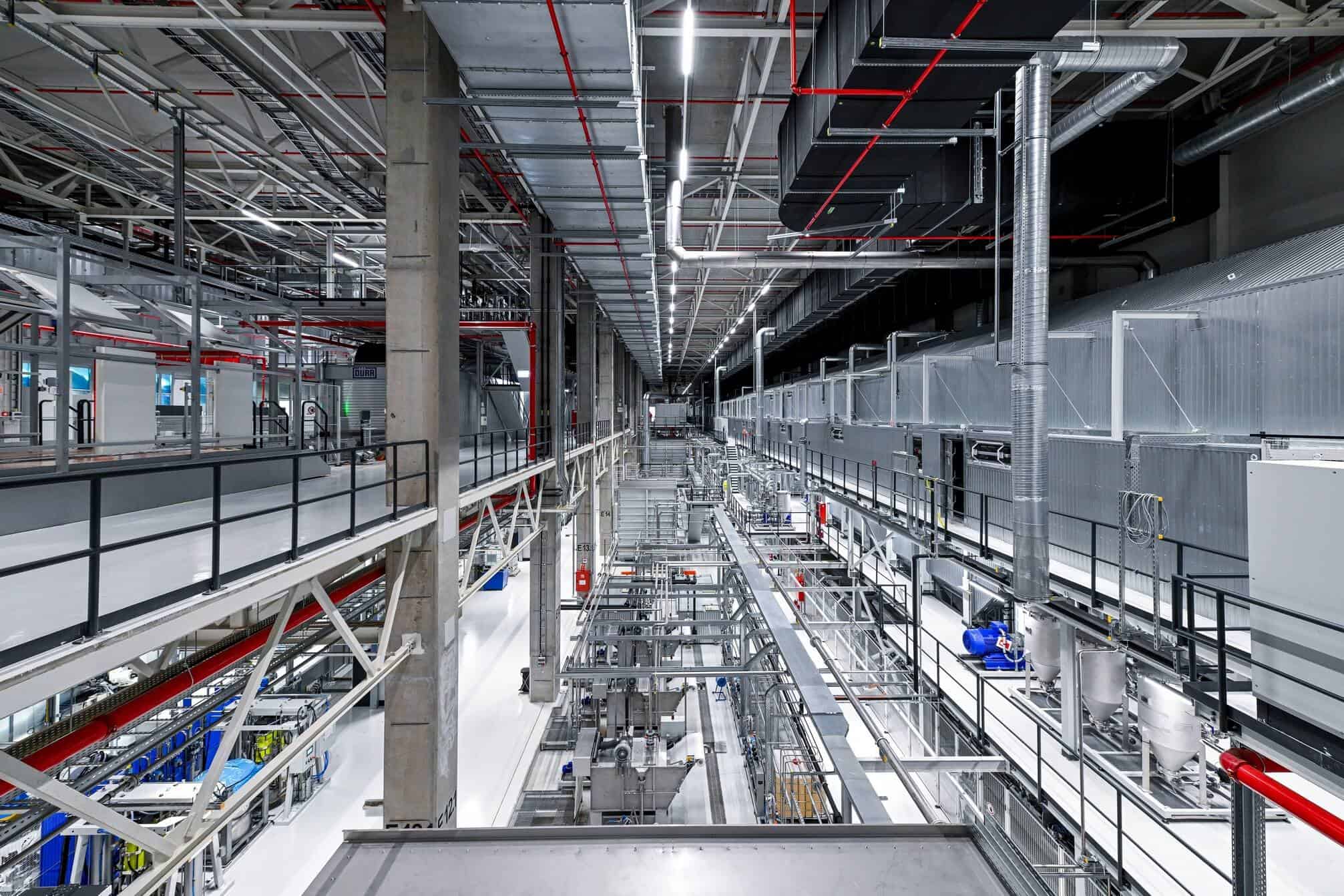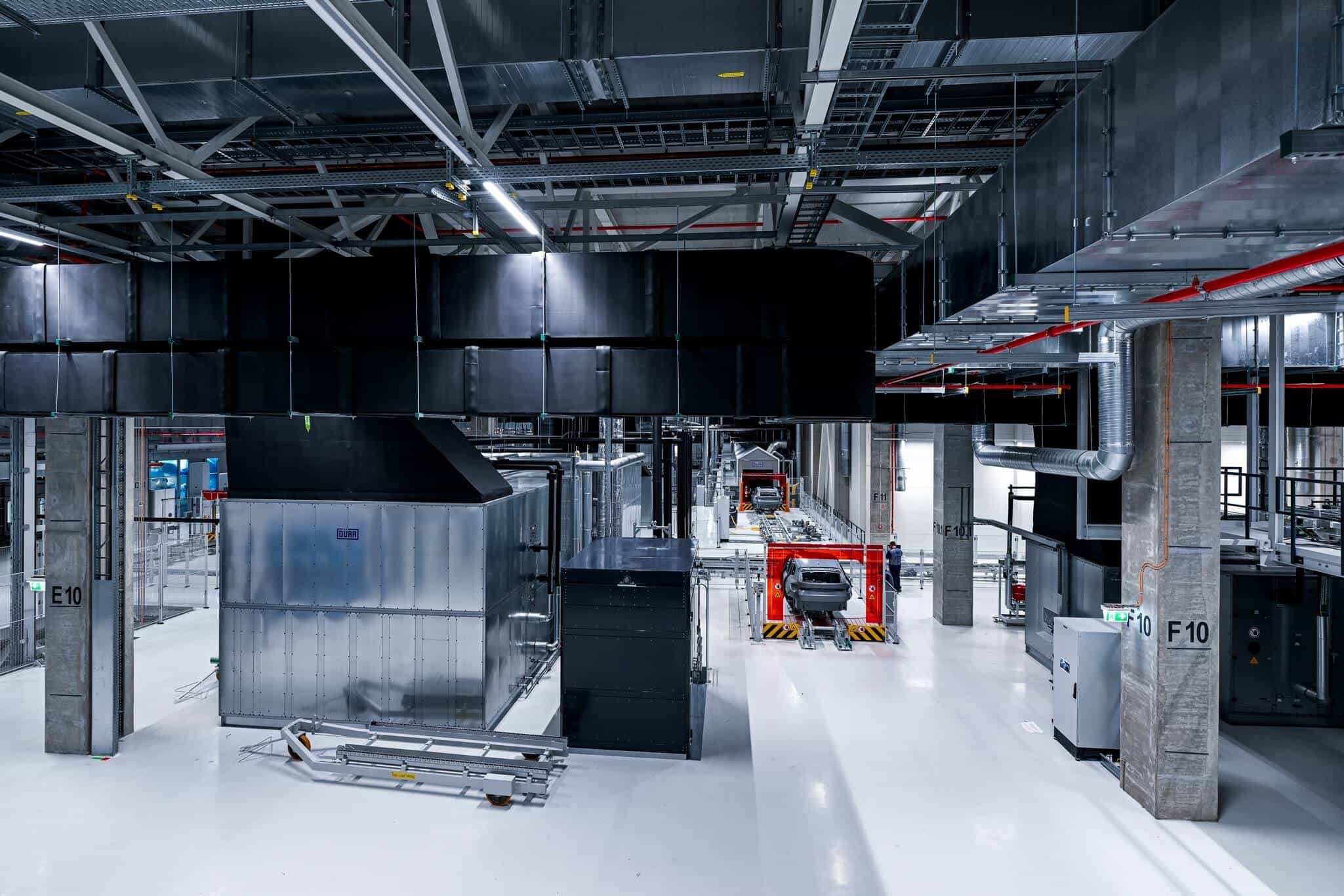 The paint shop spans 33,000 square meters and uses hot water heated at 65 degrees Celsius (149 degrees Fahrenheit) rather than the usual 90-120 degrees Celsius (194-248 degrees Fahrenheit). The water is used to supply the hall ventilation systems that provide a temperature of 22 degrees Celsius (71.6 degrees Fahrenheit) in the spray booths. Humidity has been set at 60-65%. The spray booth uses up to 90% recirculating air as only 10% has to be temperature controlled and humidified.