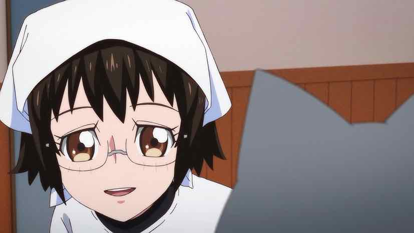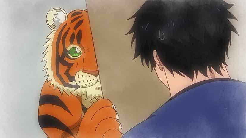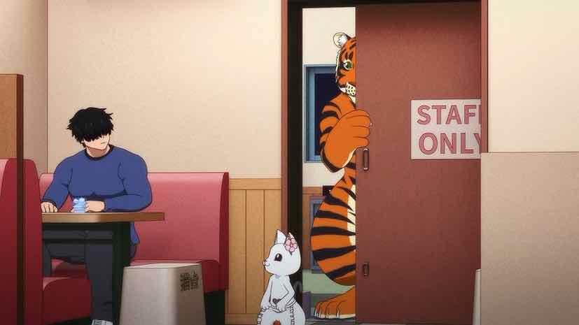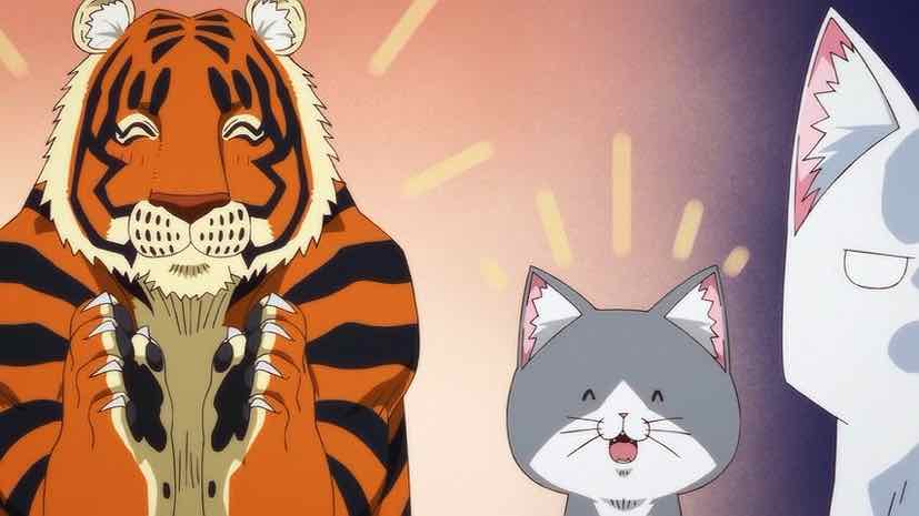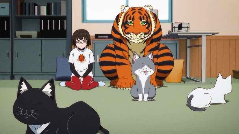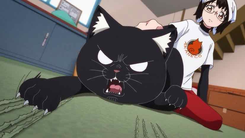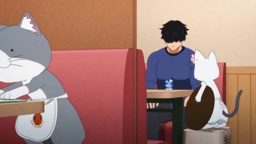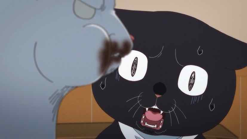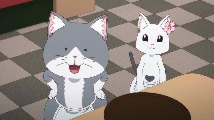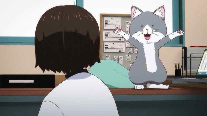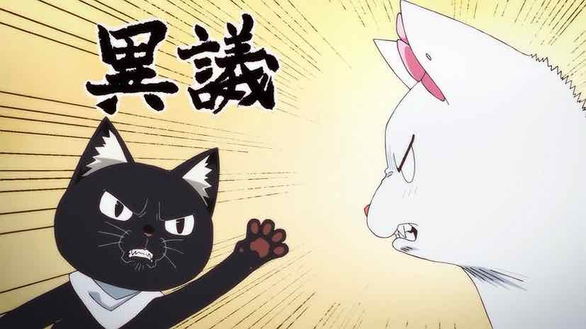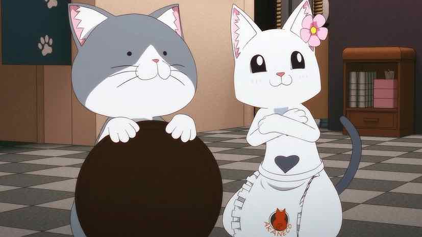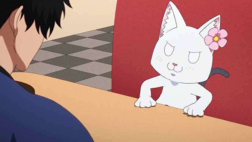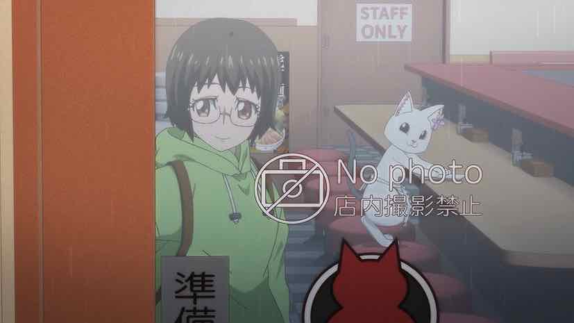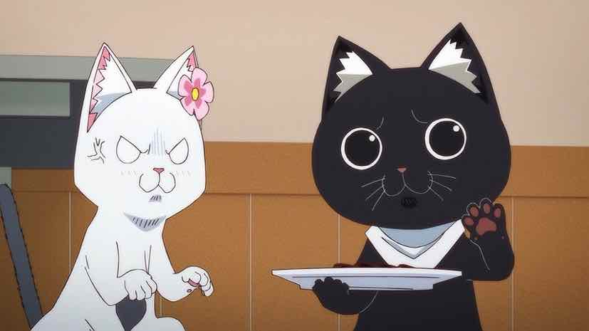 When he tells Hana he wants a word, she’s thrilled at the notion of being asked for romantic advice. But no – Taki wants her to ask Krishna to train him on how to be intimidating. Eventually there’s a feline Algonquin Roundtable gathered around Taki’s square table, with Krishna protesting her lack of fighting spirit and Sasaki opining that intimidation is really used to avoid fights, not win them. Eventually the advice settled on is that Taki is simply too nice, and needs something to protect if he’s going to savage up. It’s pretty obvious what that’s going to be, and Sakura shows up before long to join the party.