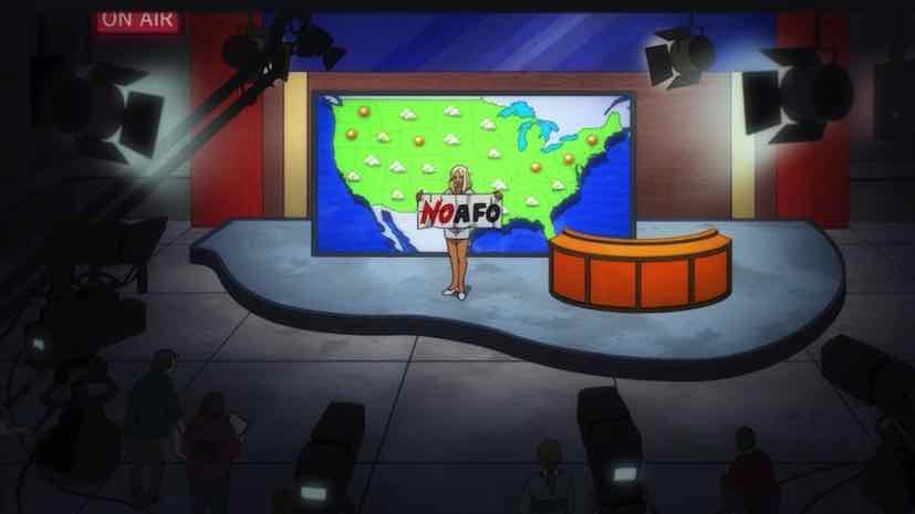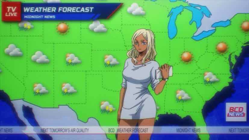 All over the map indeed – the episode even detours to America  (Washington State) where a weathergirl named Meryl is telling the viewers about how a massive cumulonimbus storm has formed (from Dabi, Shouto, and Endeavor’s flames) and combined with a tropical cyclone (Shan Shan, is that you?). She goes on to way lyrical about the butterfly effect – which is a major theme of this ep though not in the way she means it – and finally to hijack the broadcast to declare her firm opposition to pursuing appeasement with All For One. Cut to commercial.