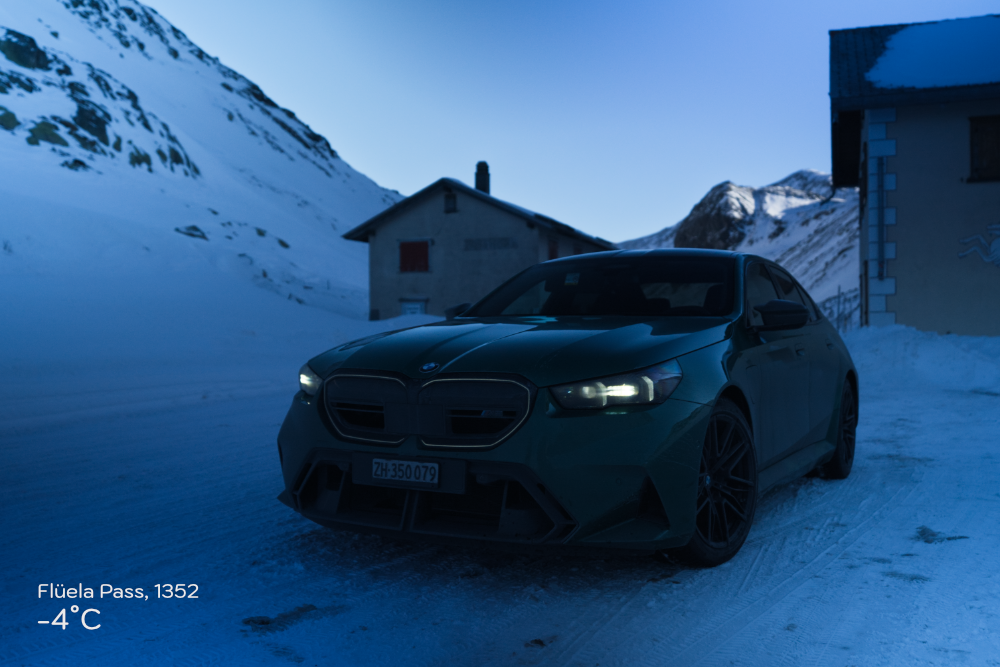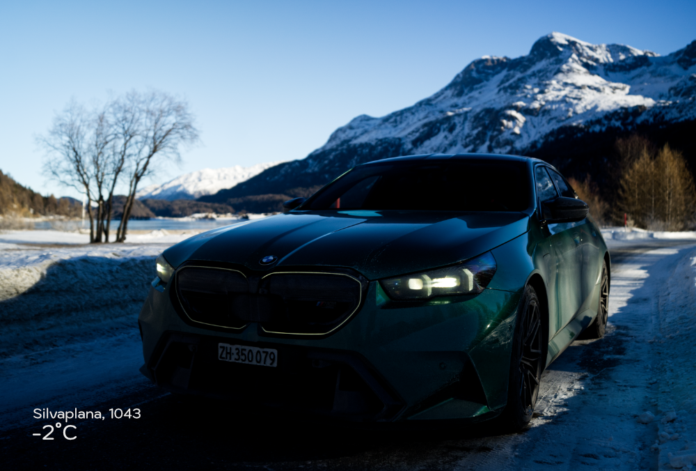 I arrive in Tiefencastel, no problems at all. I stop for a short breather, only to be punched in the face by a rather oppressing negative 7°C. Tiefencastel is the Western valley town of the 42km long Julier Pass road and its this road where I hope to dig into the G90s dynamic capabilities because so far Im not so sure what to think of the new M5, and this hasnt really got anything to do with it being a PHEV. Its just that so far there wasnt much to see other than enormous horsepower and torque.