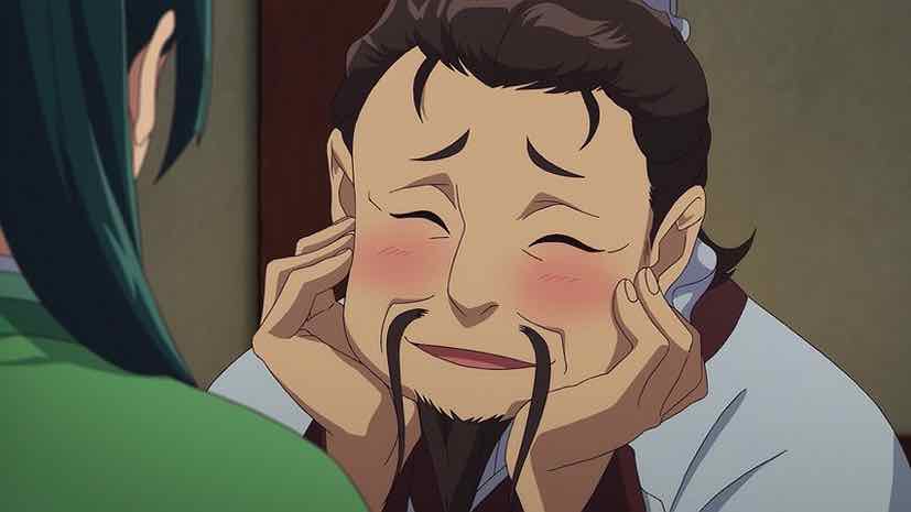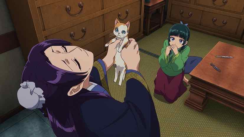 It’s nice to see Maomao and Guen interact a little more. He’s obviously nowhere close to her intellectual level but overall a decent sort, and seems to have grown quite fond of Xiaomao even if she often horrifies him. As it turns out Gaoshun is a nekozuki too, though Jinshi is not. Or claims not to be, anyway. Which takes us to the best scene in the episode by far, as Maomao tries to explain the nature of being a cat person to Jinshi, who hilariously vibes with it for an entirely different reason. And so another nekozuki is born – and the cat getting the name “Maomao” is the icing on the cake.