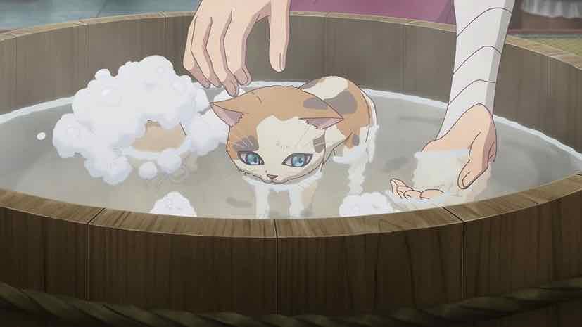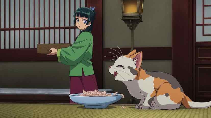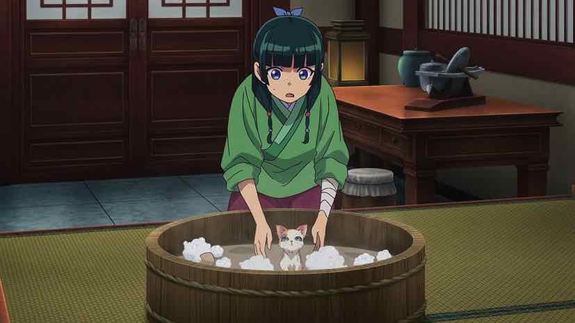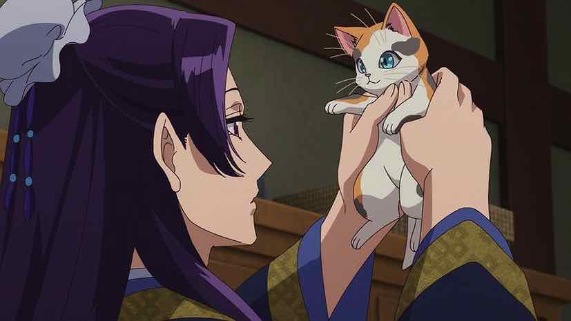 Jinshi certainly didn’t start off on the right foot (fingers) with me, but he has improved over time. He’s no fool, that’s for sure, and formidable enough to be a good foil for Maomao even if he is smitten with her. He’s quite integral to the next incident, which finds Lingli discovering a kitten on her walk (with Maomao supervising). This is an oddity, as pets are rare in the Inner Palace, must be castrated, and cannot be kept without a license. But the little princess is smitten, so it falls to Maomao to take care of the foundling. She takes it back to the climic, where it turns out Guen is quite the nekozuki.