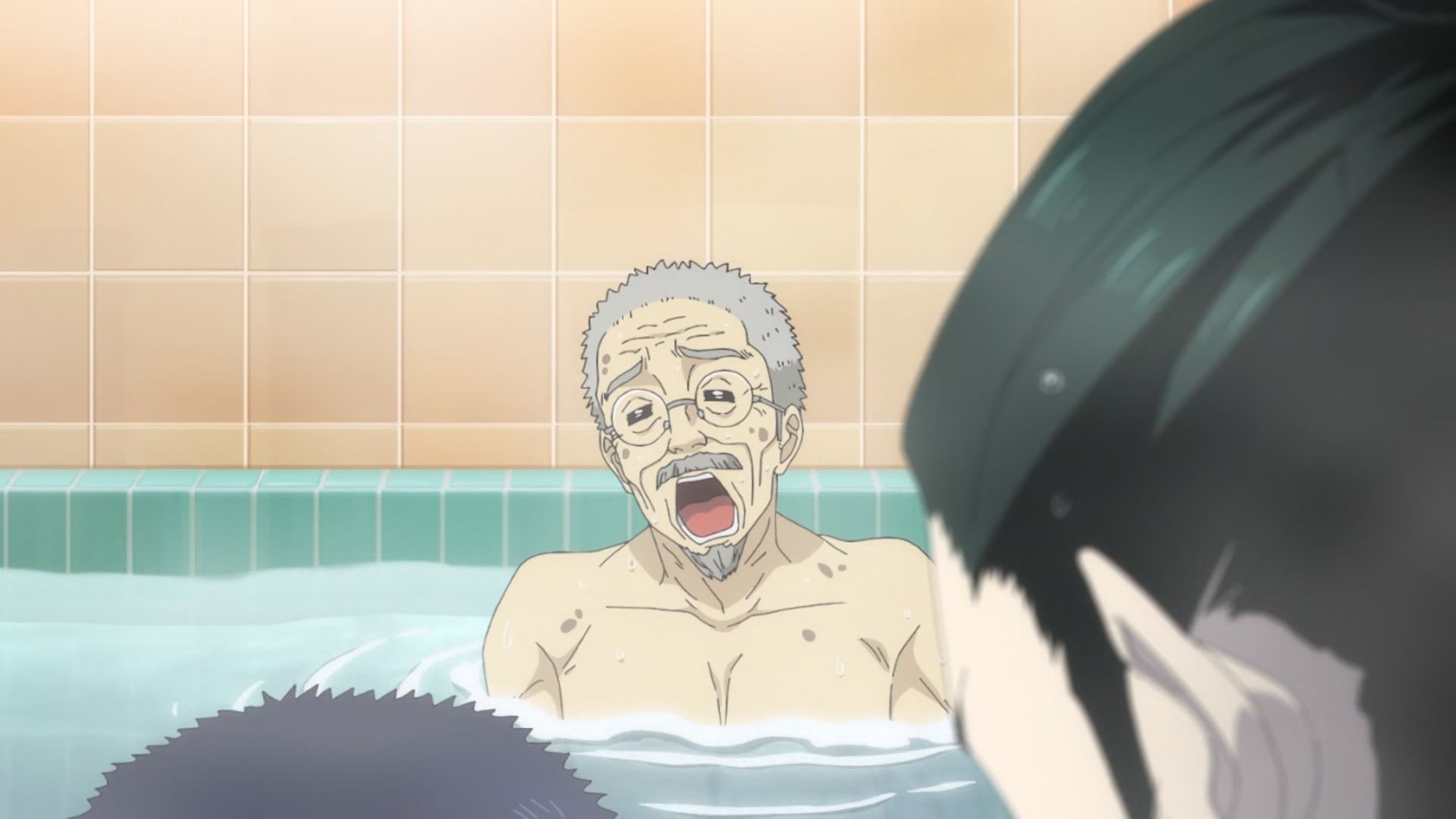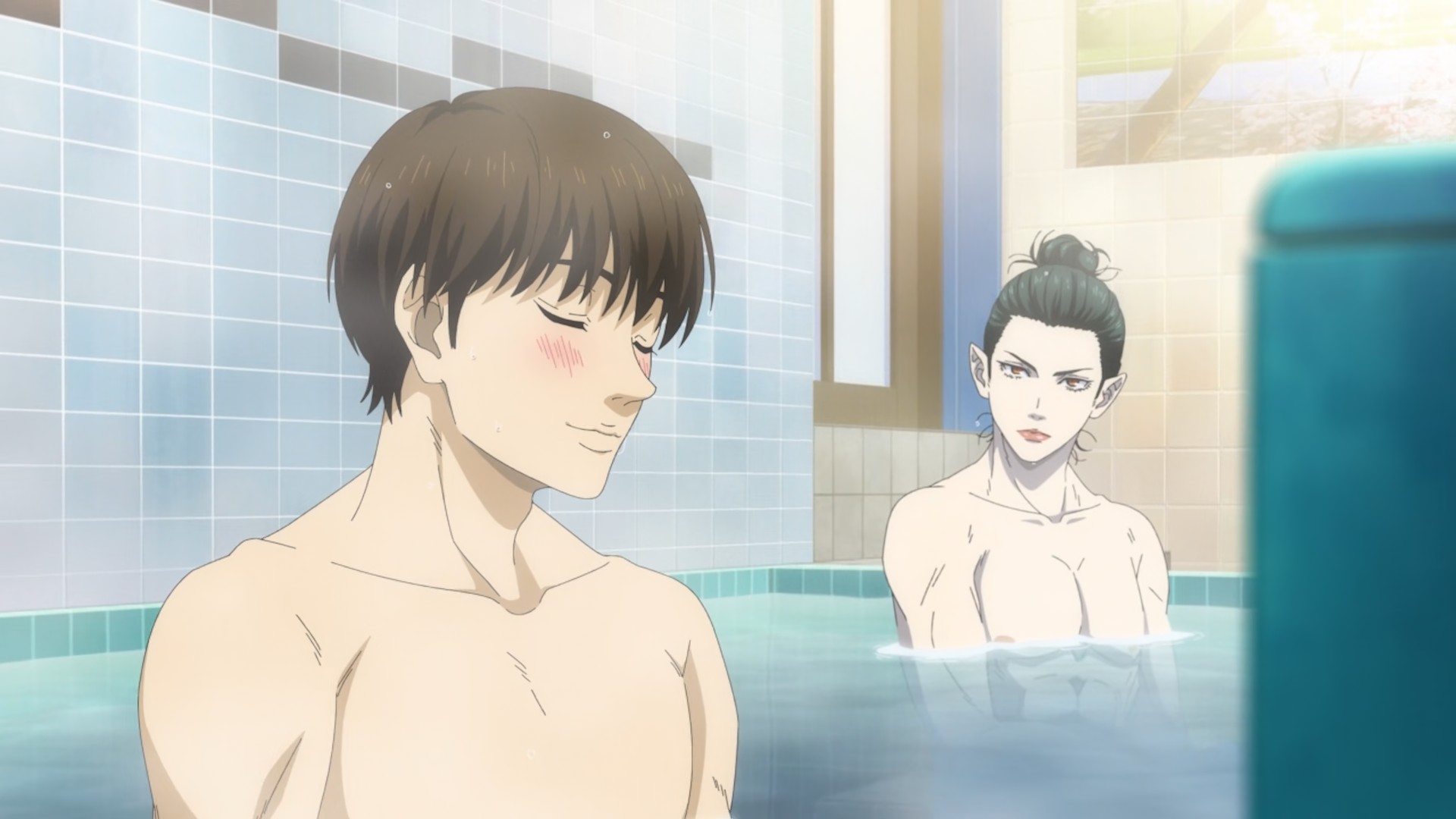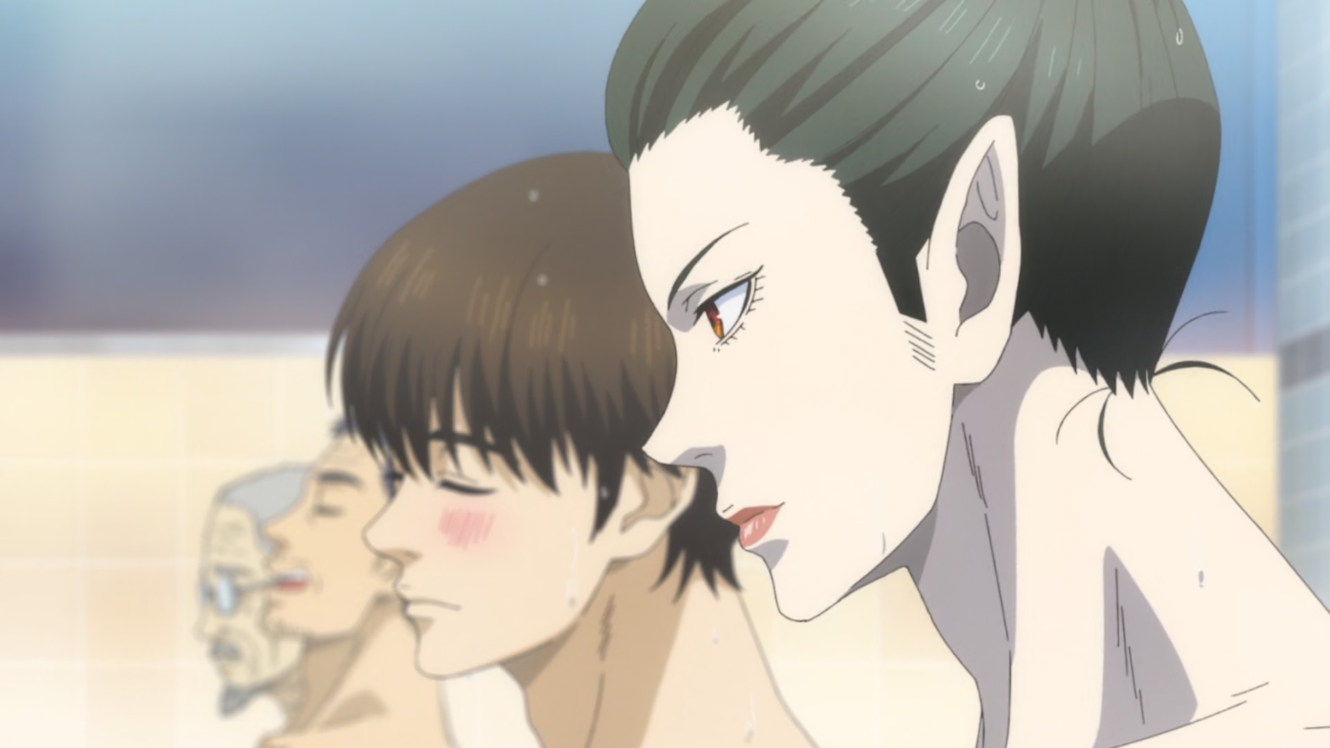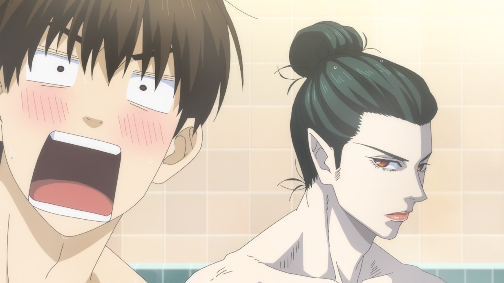I sort of had a vibe this one might be better than it sounds, and I think it’s fair to say it is. A lot of this premiere was pretty amusing actually, and Namikawa Daisuke is having a lot of fun with the titular vampire (Ranmaru). He works at a bathhouse, where the boy in question, Rihito (Kobayashi Yuusuke is quite good here as well) is the 4th-generation owner-san and about to enter high school. He took pity on Ran-chan when he showed up sunstroked and dying ten years earlier, and the vamp has had his sights set on that pure blood ever since. But only when it’s ripe (Namikawa characters do love to use that word about boys in creepy contexts).