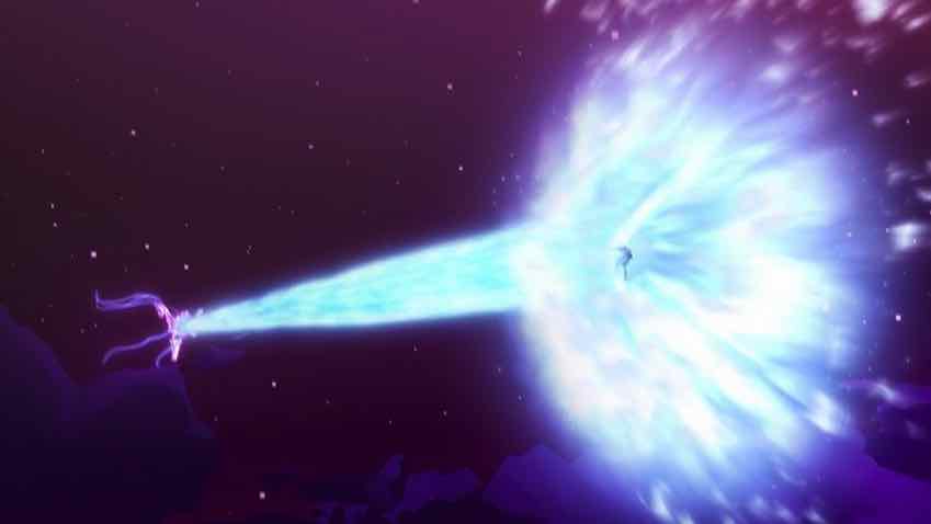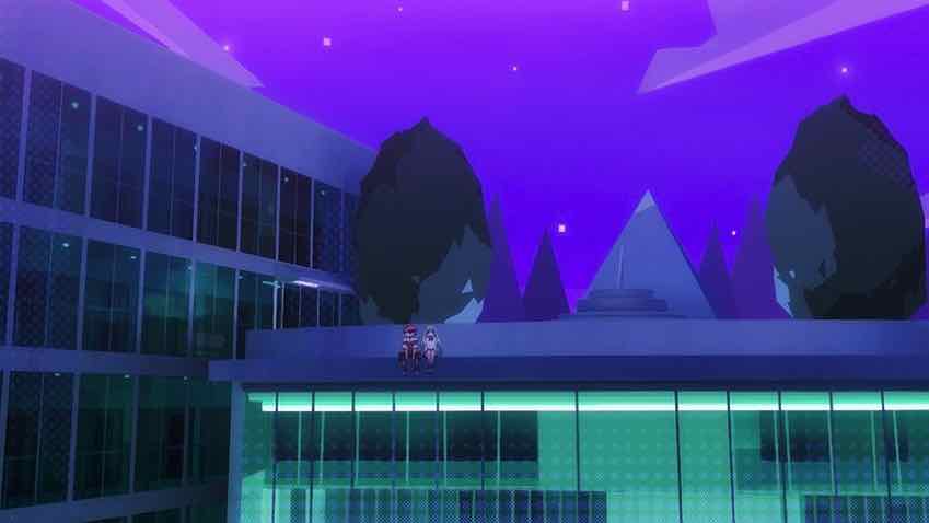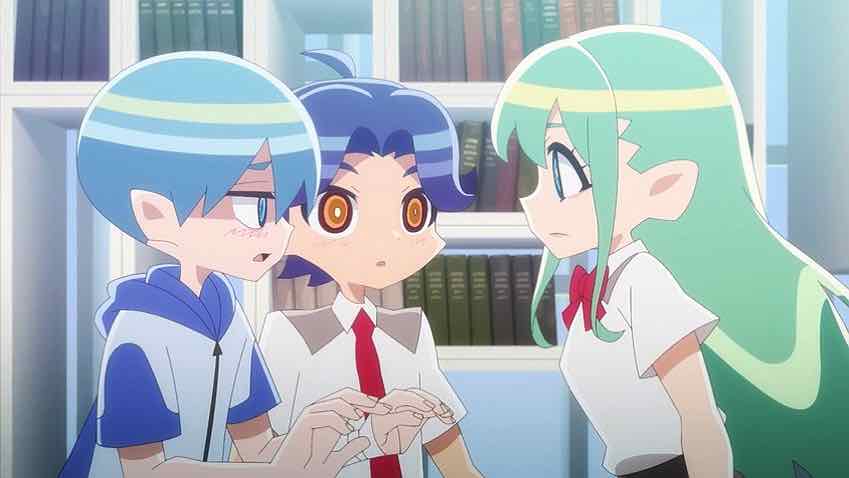 Another twist occurs when Momohime and the boys look through the library book Sayo seemed so fascinated with. We get an entire flashback sequence, differentiated from the main timeline in that it’s 100% CGI. It appears to show the world of 12,000 years ago, and presumably the past lives of the principals. A girl is chosen to be a Goddess (Moon Goddess), which her friends and family are sad about, but is ultimately for the best (according to her). Later Momohime and Sakko meet on the rooftop and the simmering tensions of their shared childhood spring to the surface. He’s reckless which annoys her, she lectures and scolds him, which he resents. But before things can get really heated another mythical monster shows up and with Toshi still dinged from last time, Momohime makes her battle debut.