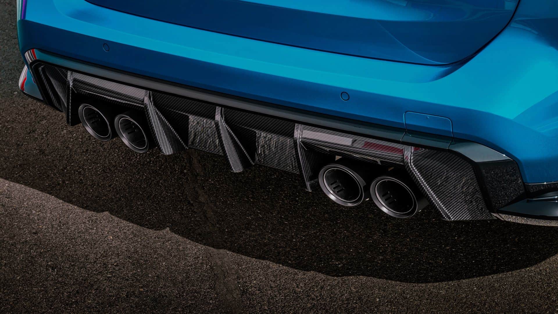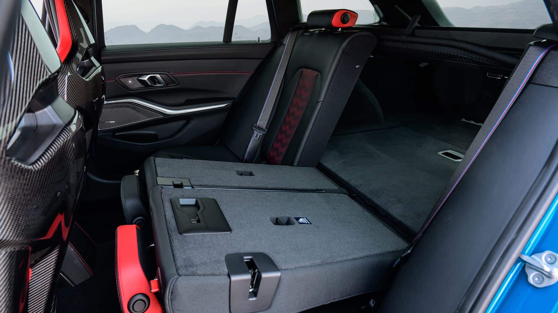 To earn the CS badge, BMW M had to do more than just massage the six-cylinder engine. The spicy M3 wagon has lost approximately 15 kilograms (33 pounds) compared to the donor car. Sadly, a carbon fiber roof is still missing, but CFRP has been extensively used elsewhere. The hood, air intakes, front splitter, mirror caps, and rear diffuser are all made from the same lightweight material. The carbon bucket front seats are part of the diet and come as standard. Sound wise, there is a model-specific exhaust system with a titanium rear silencer and two pairs of tailpipes painted in matte black.