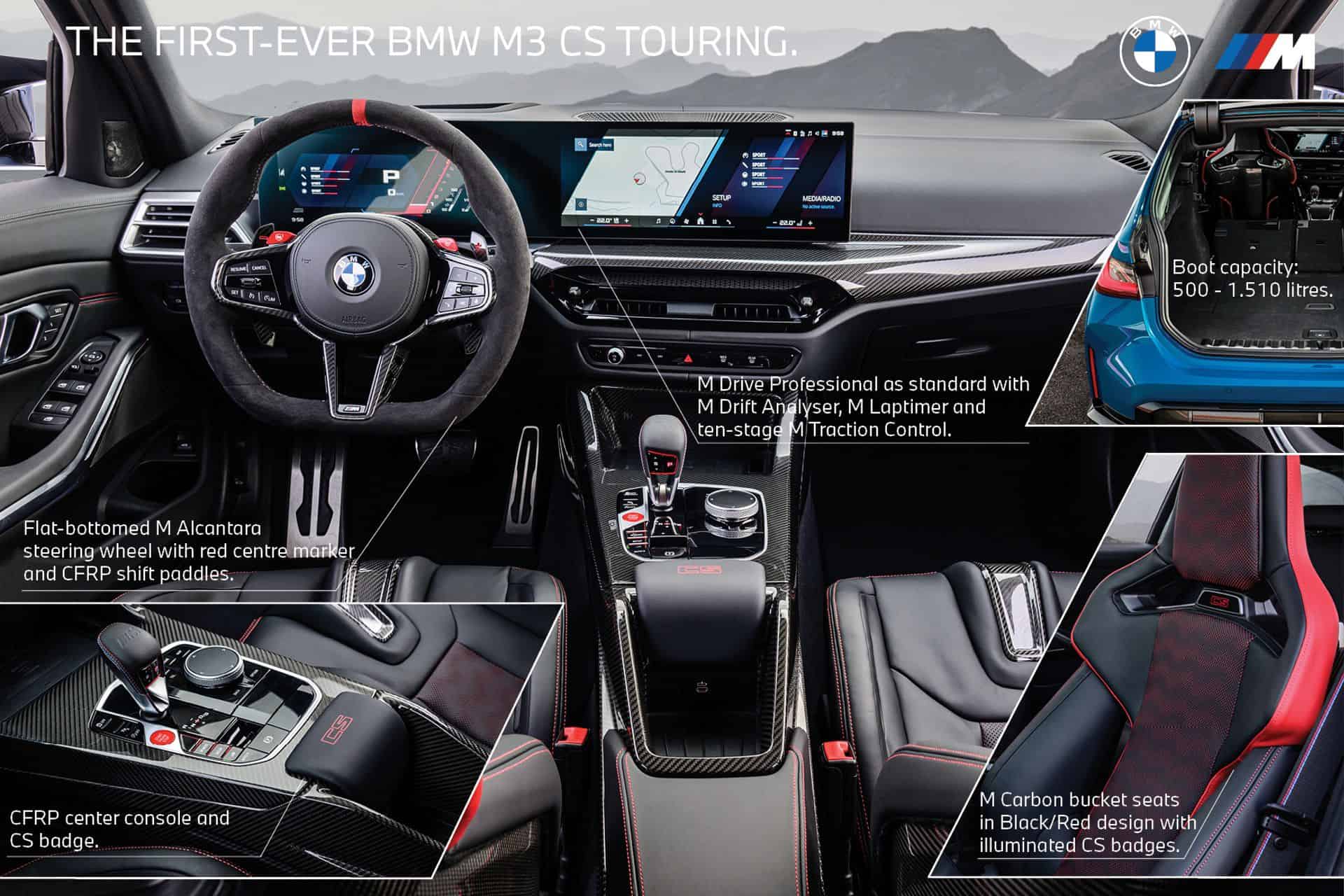 The interior is exactly what you’d expect from CS models. It starts with the black/red Merino leather and continues with the M Alcantara steering wheel with a flat-bottomed rim and red center marker in the 12-o’clock position. Naturally, the CS badge and inscription appears in several spots throughout the cabin. Lastly, BMW still offers the iDrive 8.5 operating system.
